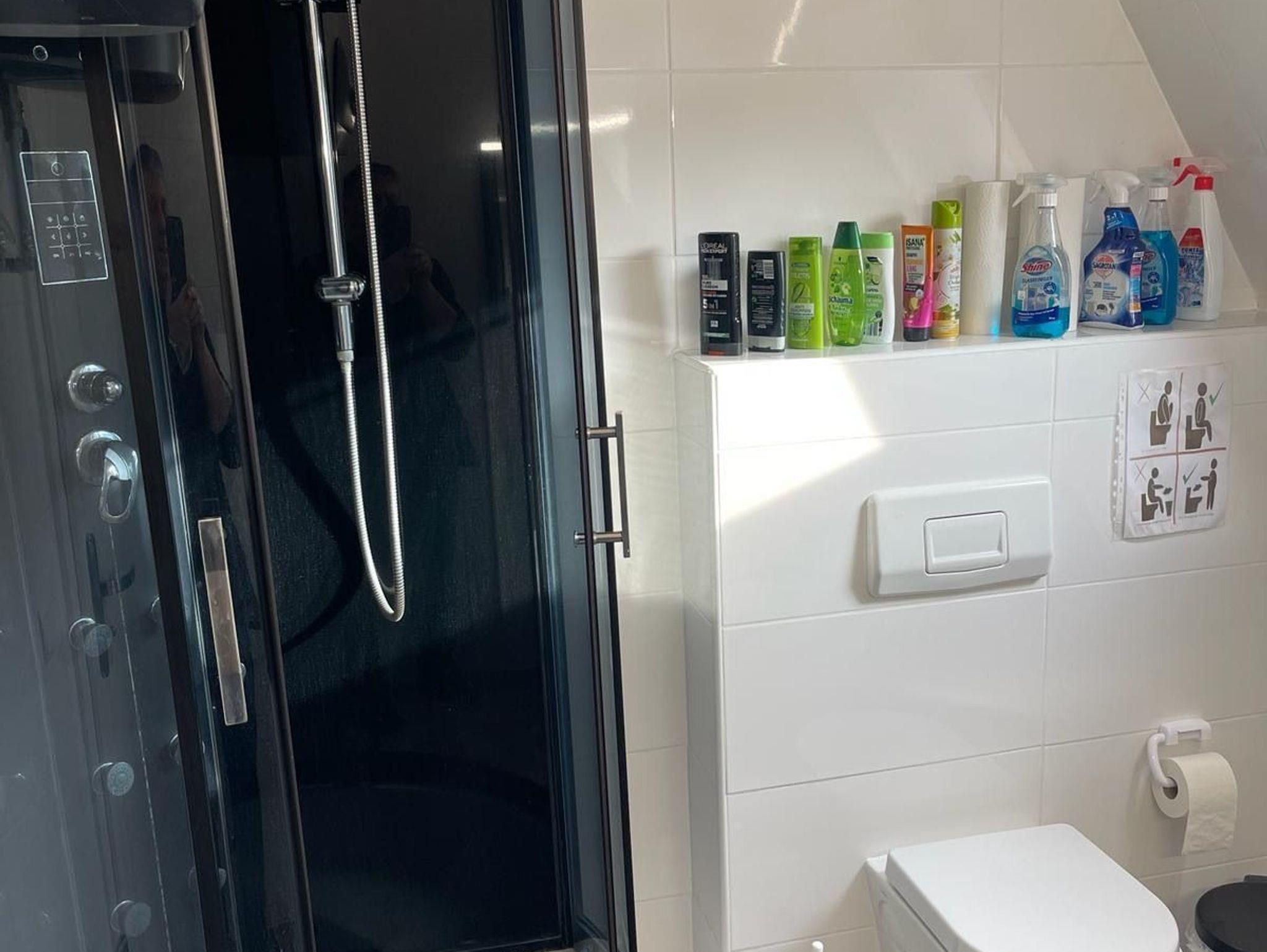 Das gemeinschaftliche Badezimmer verfügt außerdem über eine Waschmaschine.