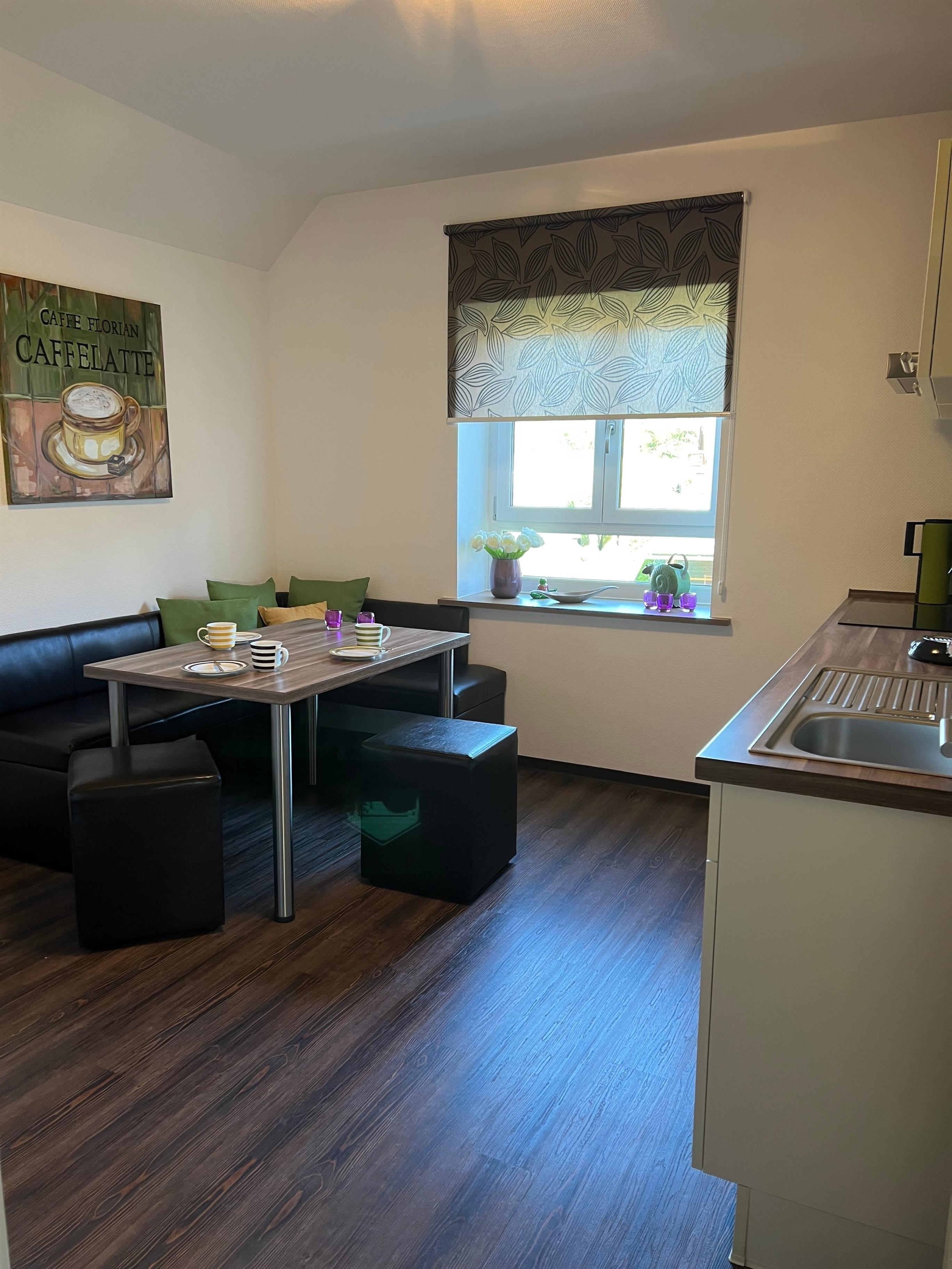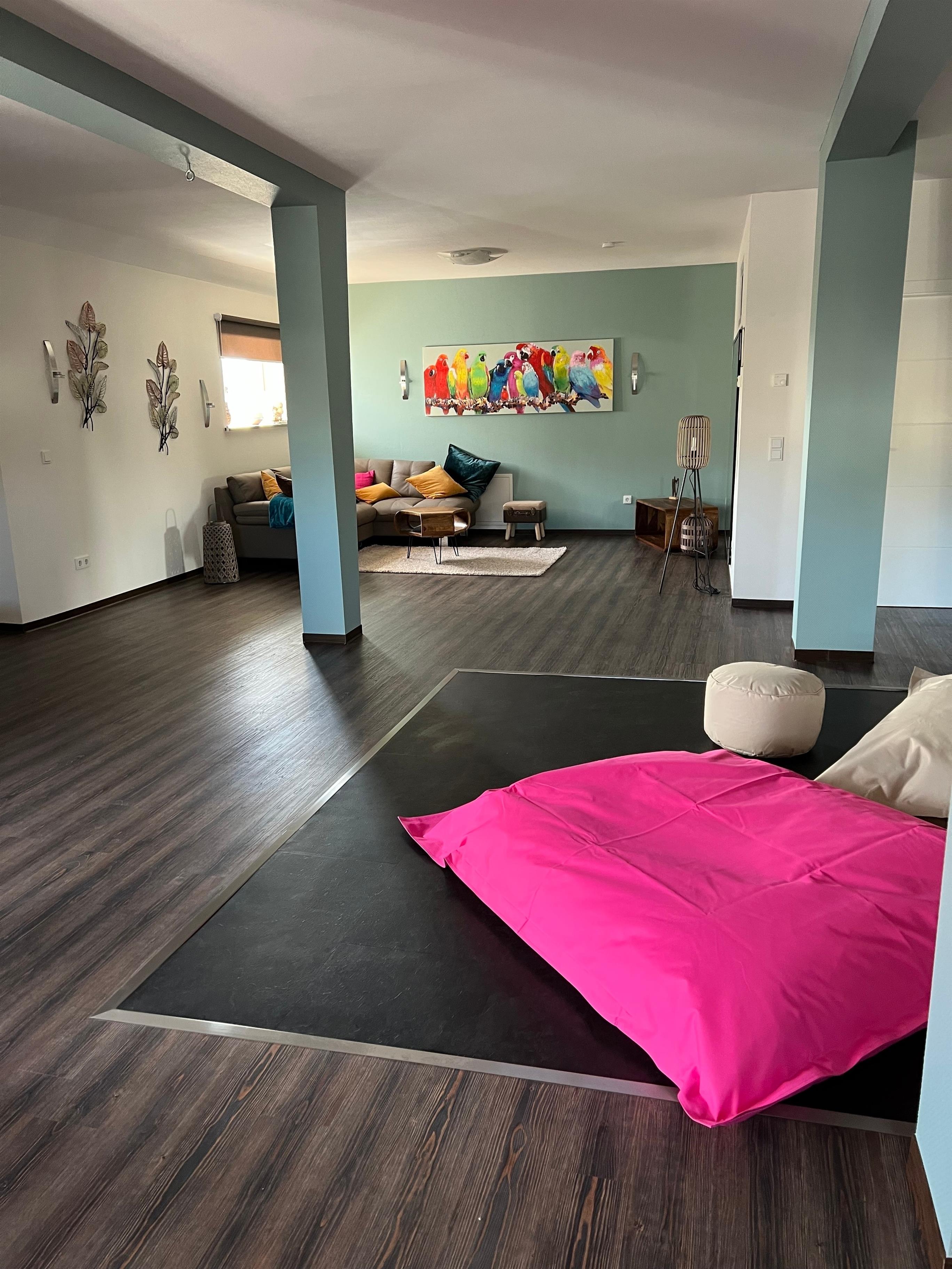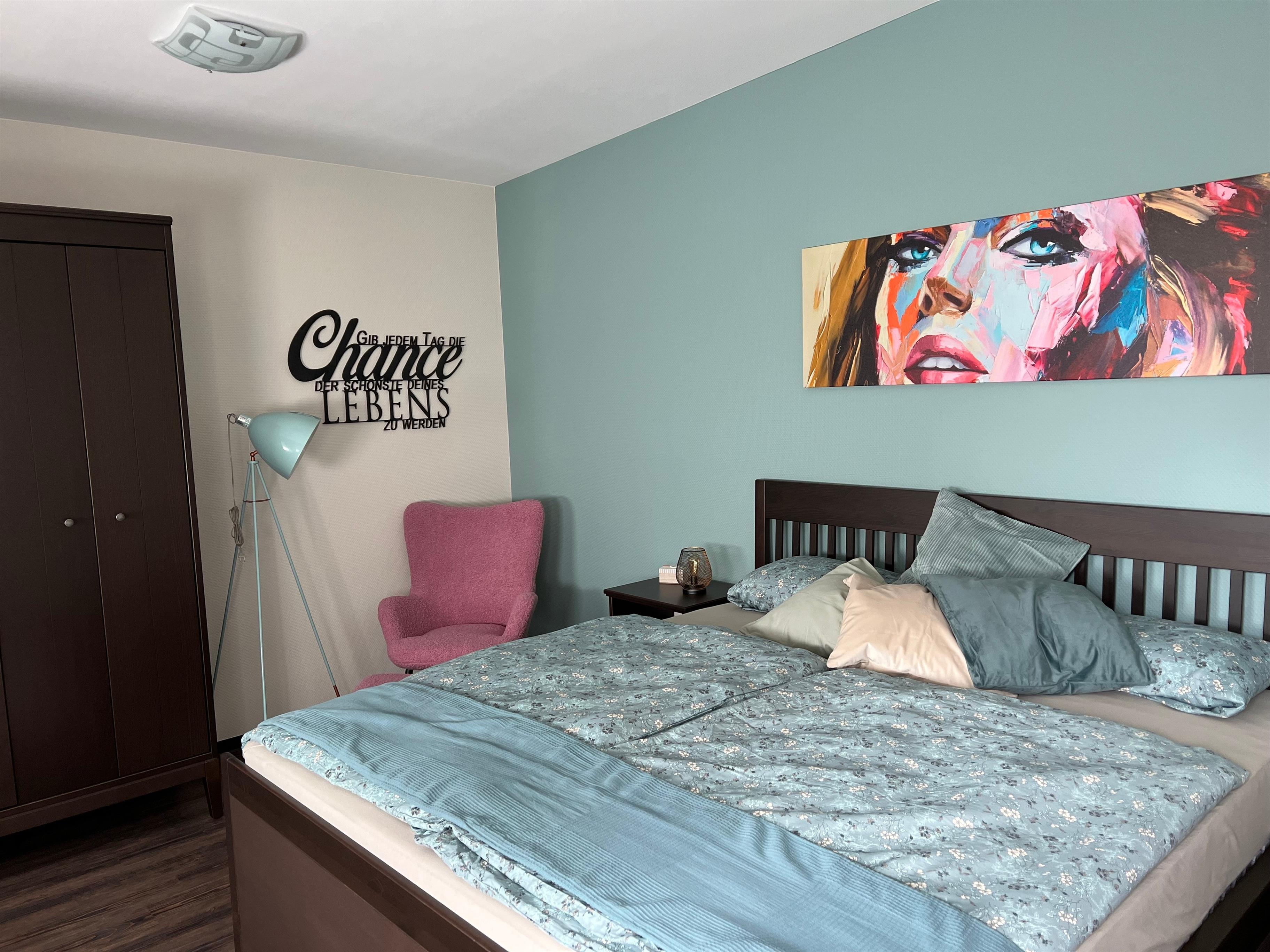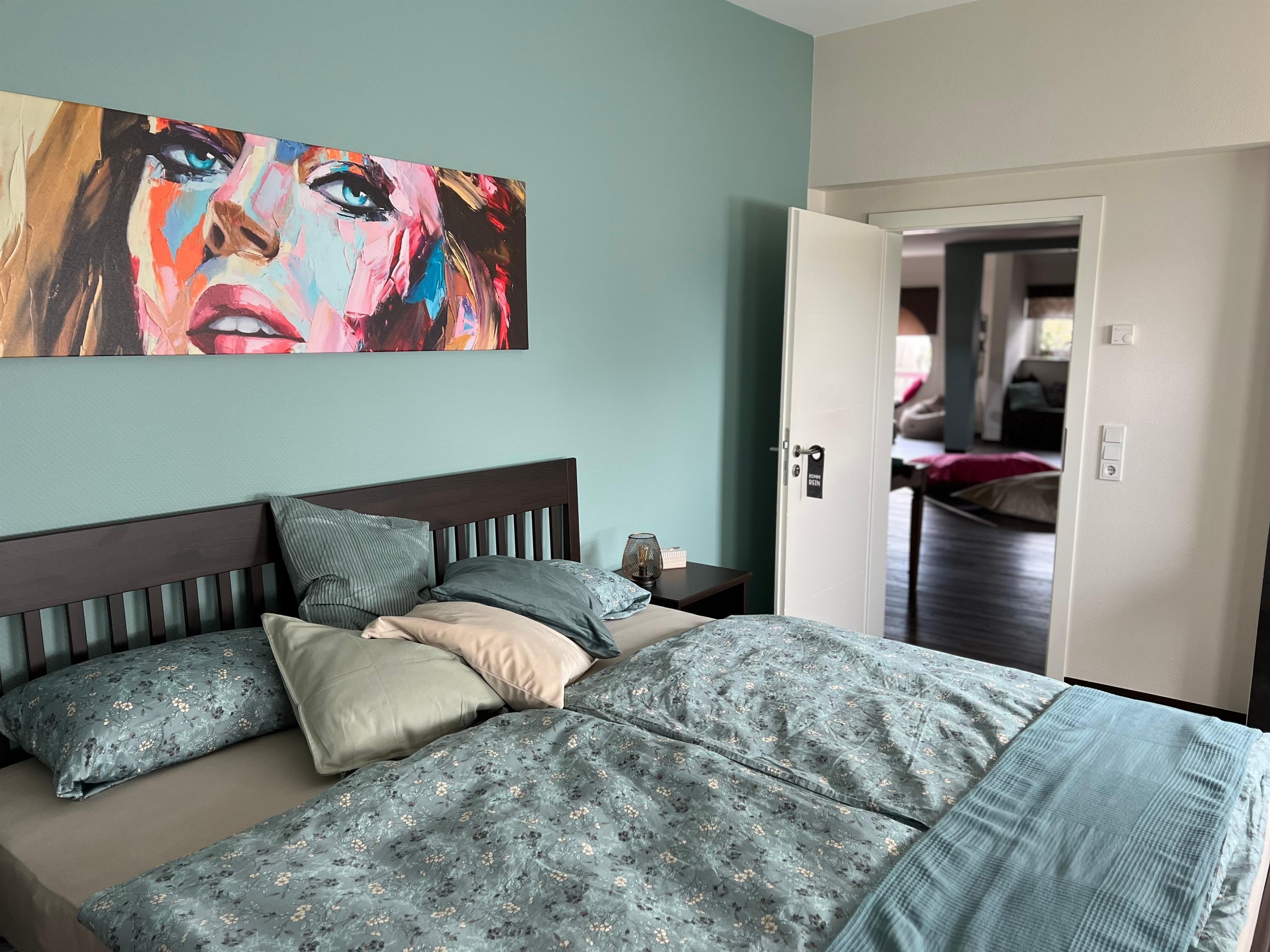 Die Wohnung befindet sich im 1. OG. Sie verfügt über 1 Schlafzimmer mit Doppelbett, einen Wohnbereich, 1 offenen Chill-Out Bereich, 1 Badezimmer, 1 Gäste WC, eine voll ausgestatte Küche, sowie ein Büro für Homeoffice.