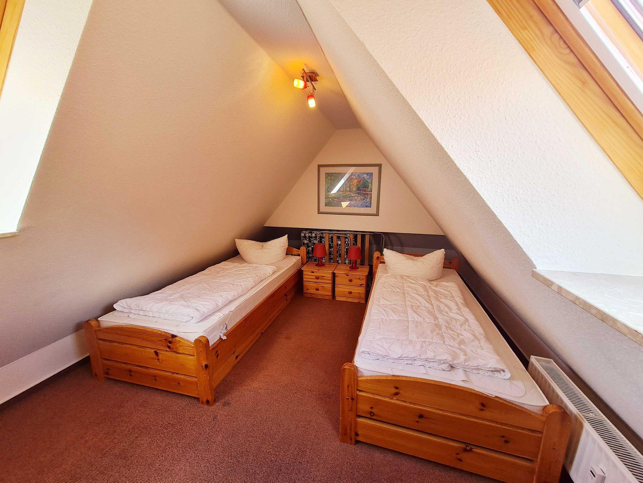 • Schlafzimmer II: mit der Treppe nach oben auf der offenen Galerie zwei Einzelbetten 90x200 m, Gästeklappbett + Gästematratze, Schrank, Nachttische, Lampen, Verdunklung der Dachflächenfenster mgl.