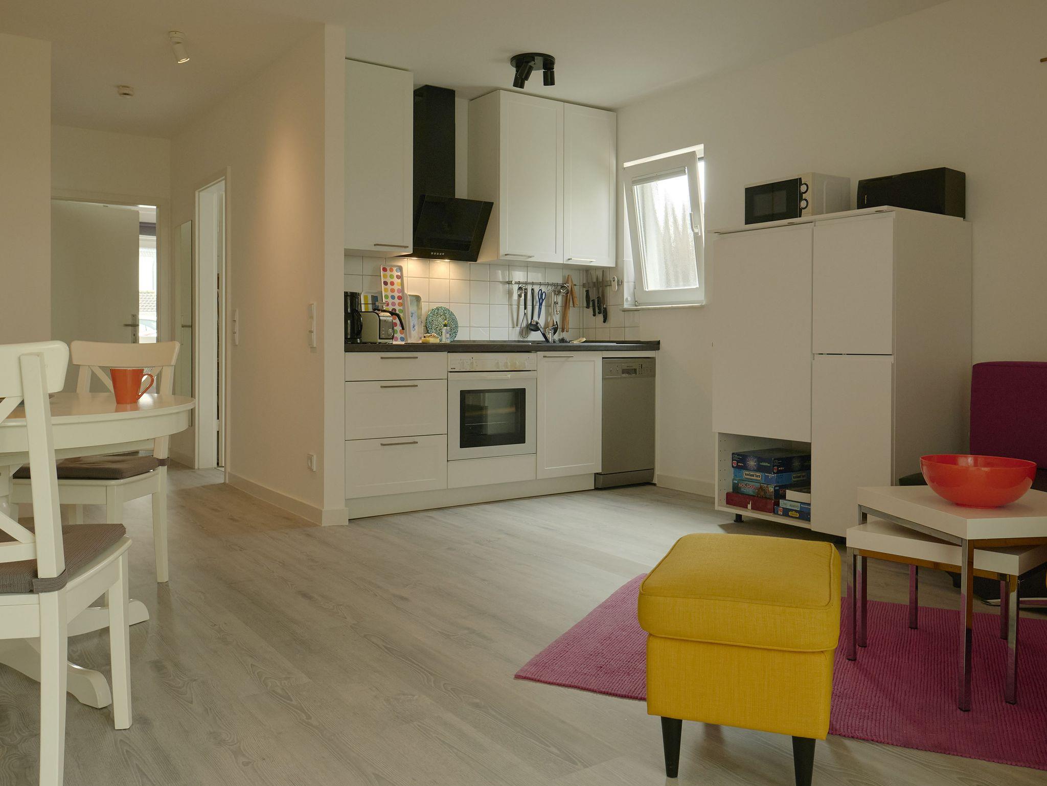 Die Einrichtung der FeWo ist modern gehalten. Mit einer kompletten, kleinen Küche.