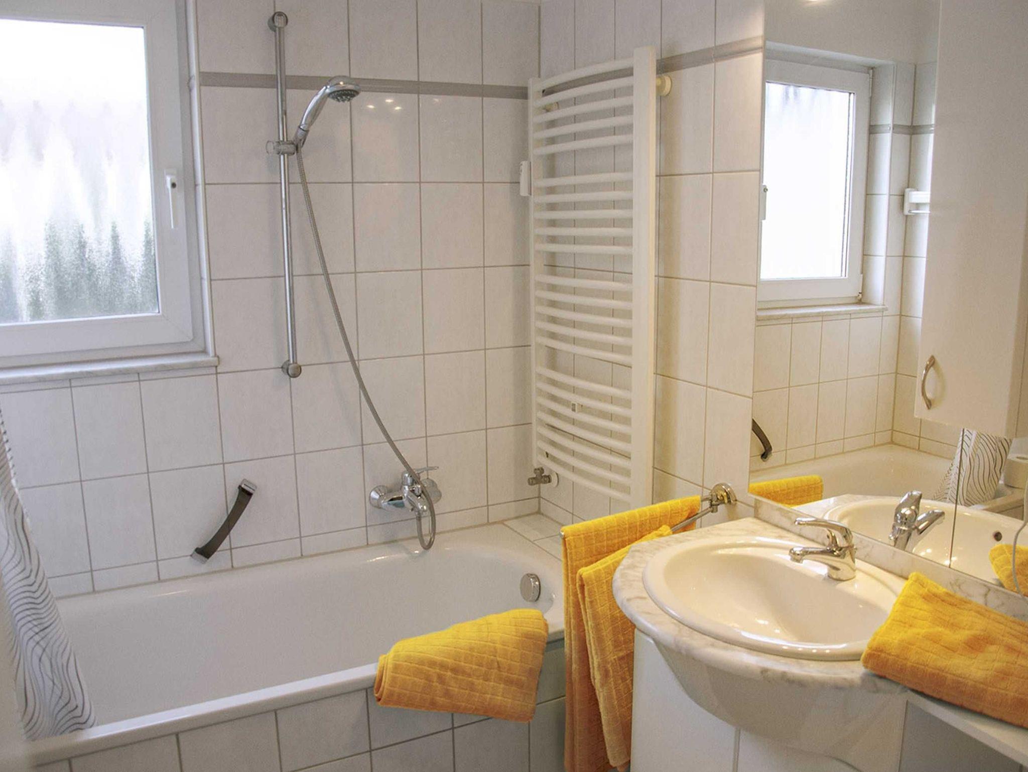 • Das Bad hat eine Wanne und ein Tageslichtfenster.