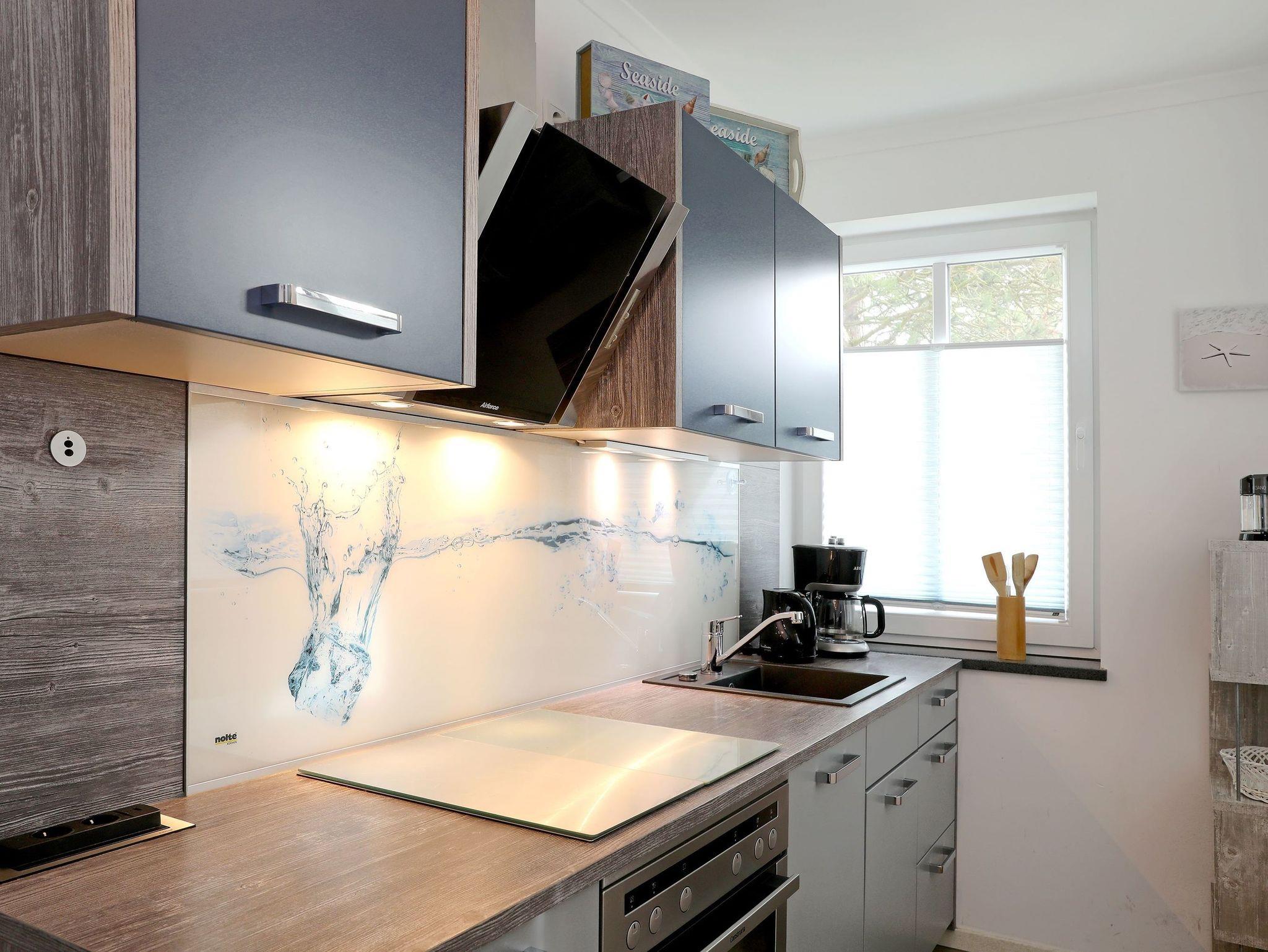 Die Küche ist ein echtes luxuriöses Highlight: Die größten Besonderheiten sind das beleuchtbare riesige Glasbild mit Eiswürfel-Motiv im Hintergrund, sowie die hochmodernen in der Arbeitsplatte versenkbaren Steckdosen-Leisten. Ansonsten gehören zur Küchen-Ausstattung: Geschirrspüler, Freistehender Kühlschrank mit Gefrierfach, Kaffeemaschine, Wasserkocher, Toaster, Mixer, 4-Platten Herd (Ceran) mit Backofen, Mikrowelle, hochmoderne Dunstabzugshaube und umfangreich bestückte Geschirrschränke und Besteckfächer.