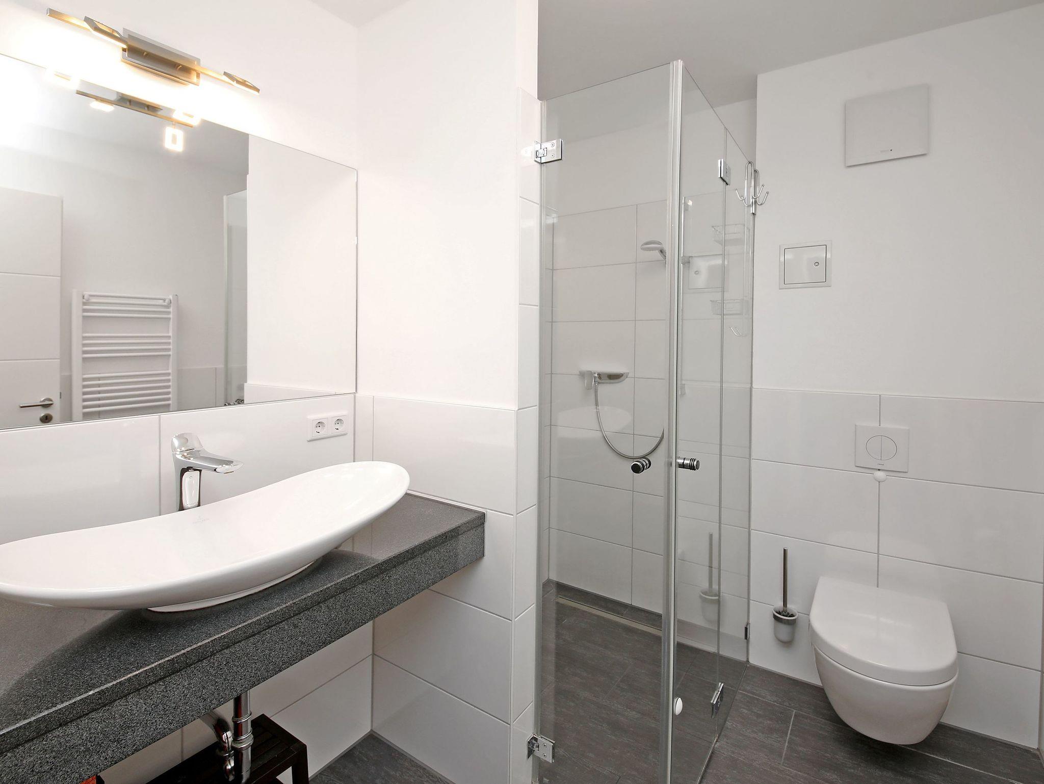 Das Badezimmer ist mit einer bodengleichen Dusche, einem Villeroy[&]Boch Aufsatz-Waschtisch, einem Wandspiegel und einem Fön ausgestattet. Ferner rundet ein spülrandloses Hänge-WC mit Komfortschließung ebenfalls von Villeroy[&]Boch neben hochwertigen Armaturen die Bad-Ästhetik ab.