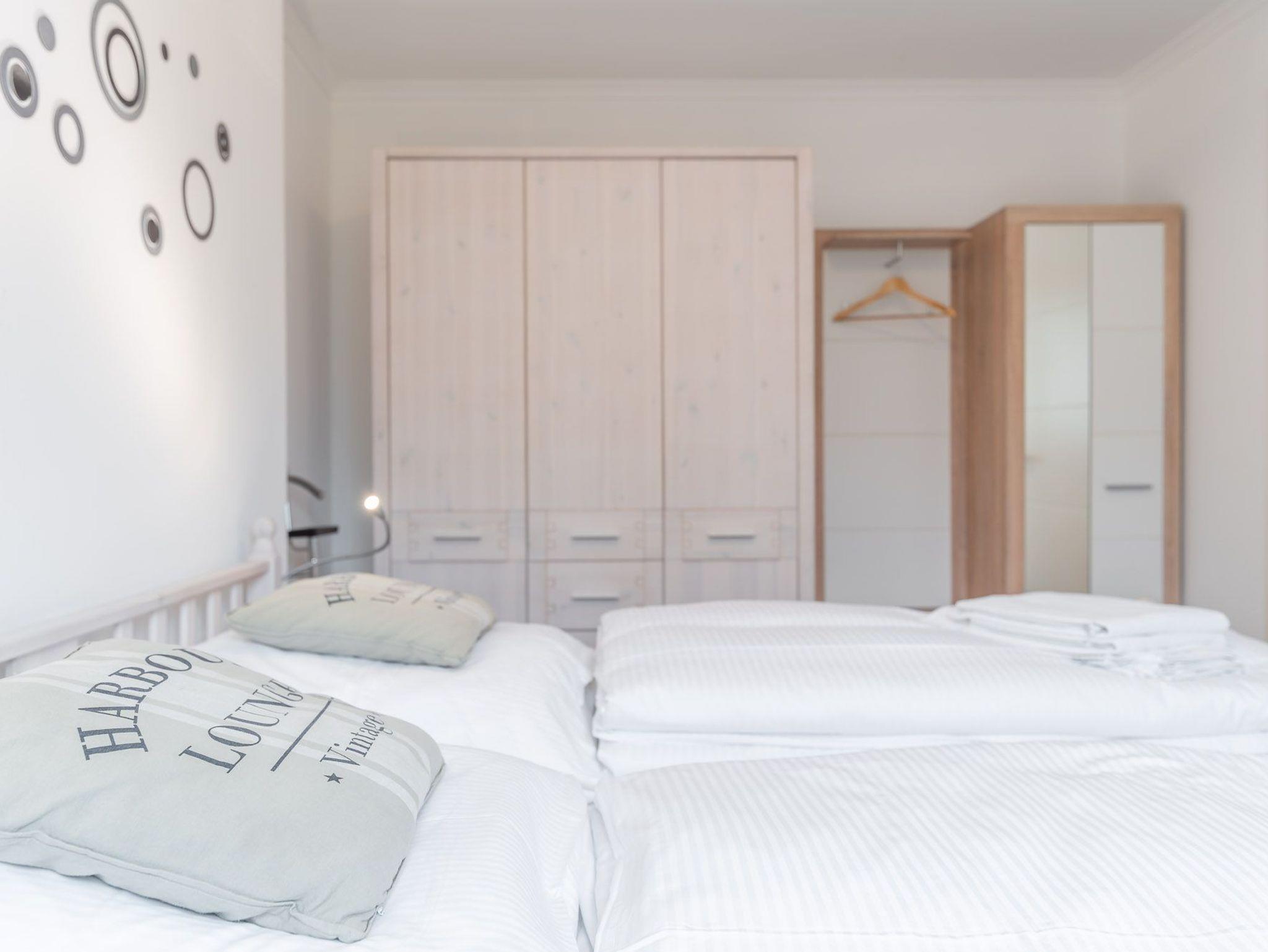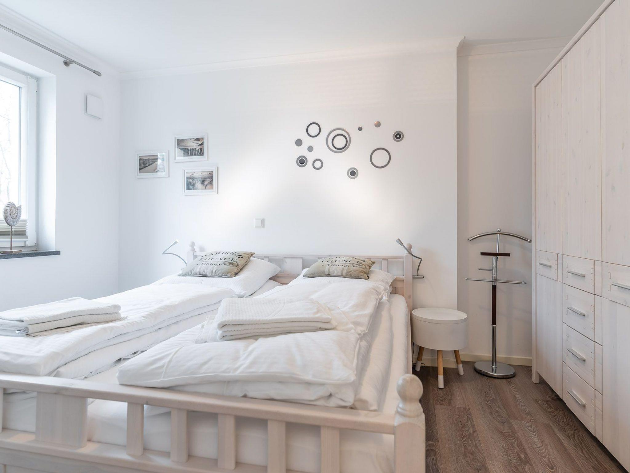 Im freundlichen Schlafzimmer finden Sie neben einem weiteren LED-TV ein komfortables Doppelbett (1,80 m) und einen geräumigen Kleiderschrank vor.