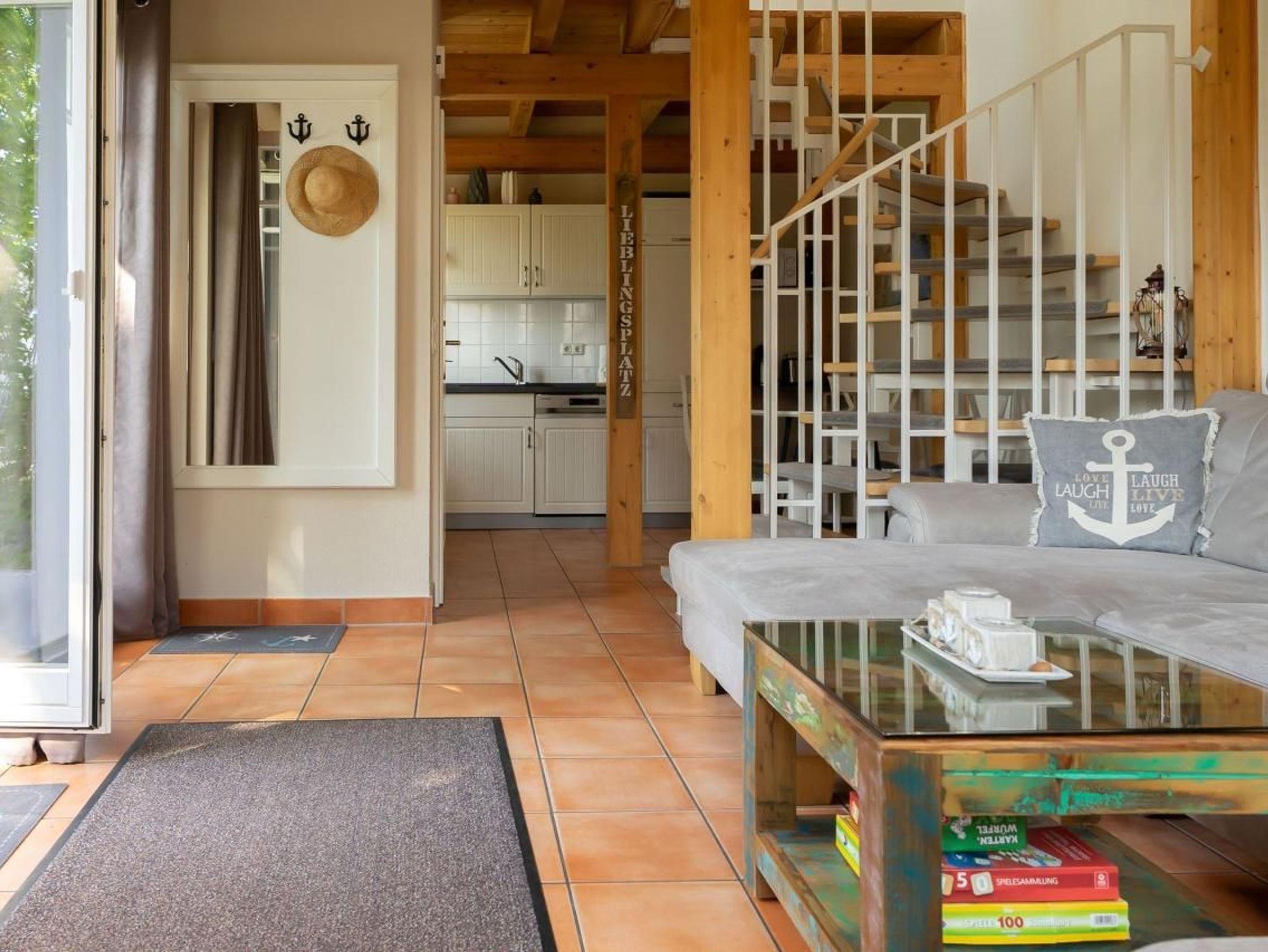 Modernes, gemütlich eingerichtetes Ferienhaus über zwei Etagen mit ca. 50 m² Wohnfläche ? ideal für bis zu 4 Personen. Im Erdgeschoss befinden sich ein einladender Wohnbereich mit ausziehbarer Schlafcouch (für 2 Personen), Sessel, Flachbild-TV, CD-Player und HiFi-Anlage sowie ein Essbereich und eine voll ausgestattete Küche mit Herd, Backofen, Kühlschrank, Mikrowelle und Geschirrspüler.
