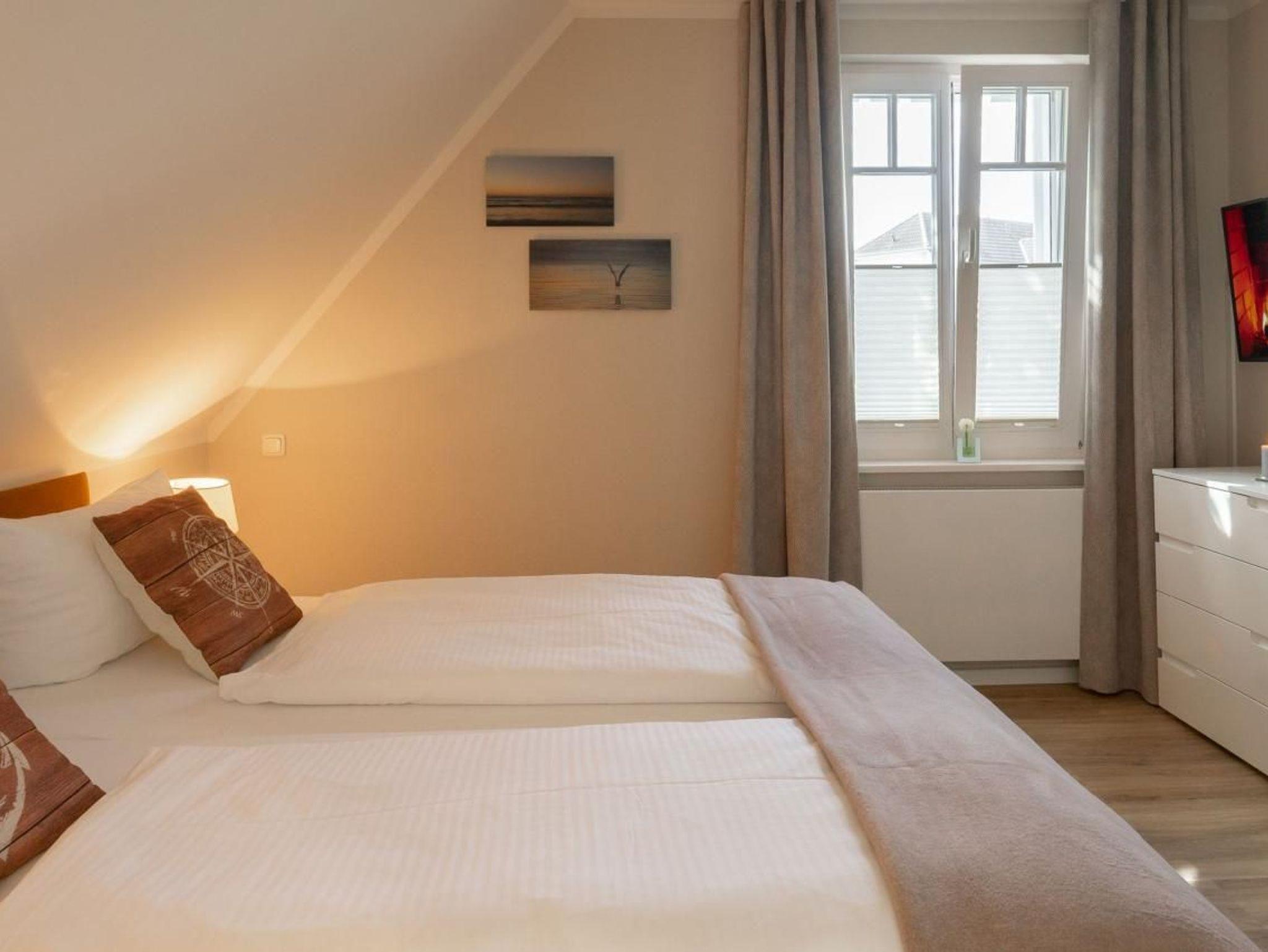 Über eine Wendeltreppe gelangen Sie in das Obergeschoss mit einem gemütlichen Schlafzimmer, ausgestattet mit einem Doppelbett, einem großen Kleiderschrank für Ihre Urlaubsgarderobe und ein zusätzliches TV- Gerät.