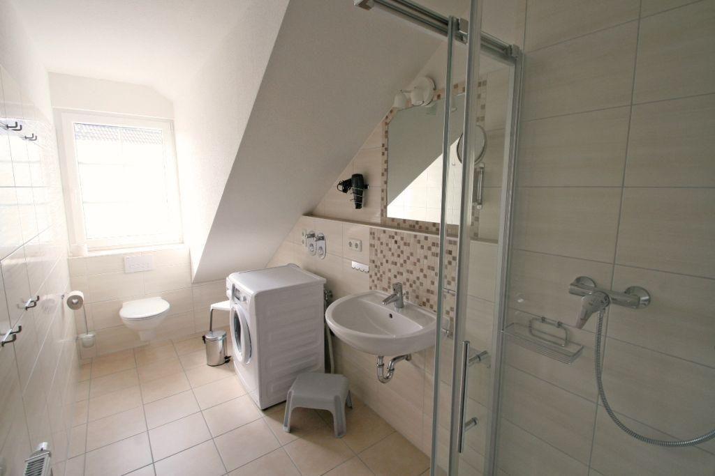 Die Wohnung verfügt über ein modernes Duschbad mit Waschmaschine sowie Trockner. Alle Räume sind separat begehbar. Die Fenster (bis auf Gauben) sind für eine Verdunkelung mit Außen-Rollläden ausgestattet. Alle Räume besitzen Fußbodenheizung.