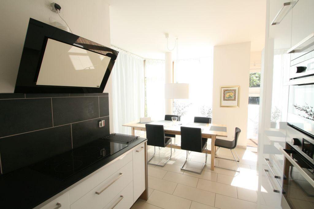 Die hochwertige offene Einbauküche mit großzügigem Esstisch für bis zu 5 Personen ist mit Geschirrspüler, Backofen, Cerankochfeld, Kühlschrank mit Gefrierfach, Kaffeemaschine, Wasserkocher, Toaster etc. ausgestattet und komplett eingerichtet.