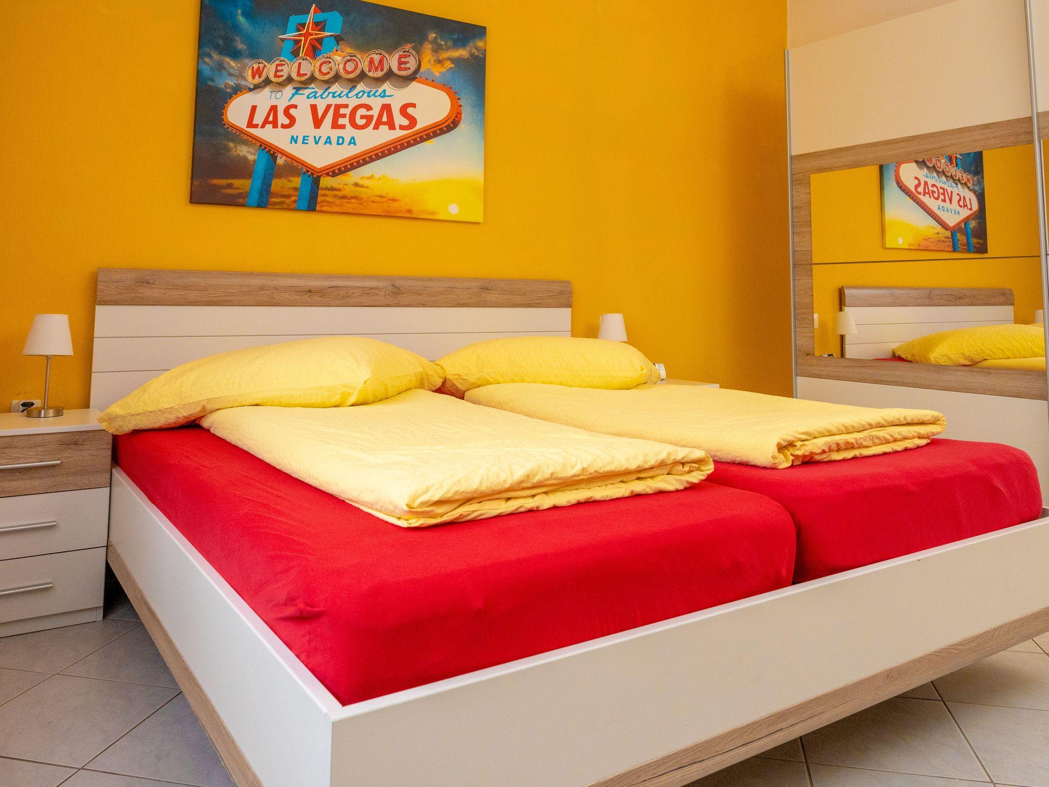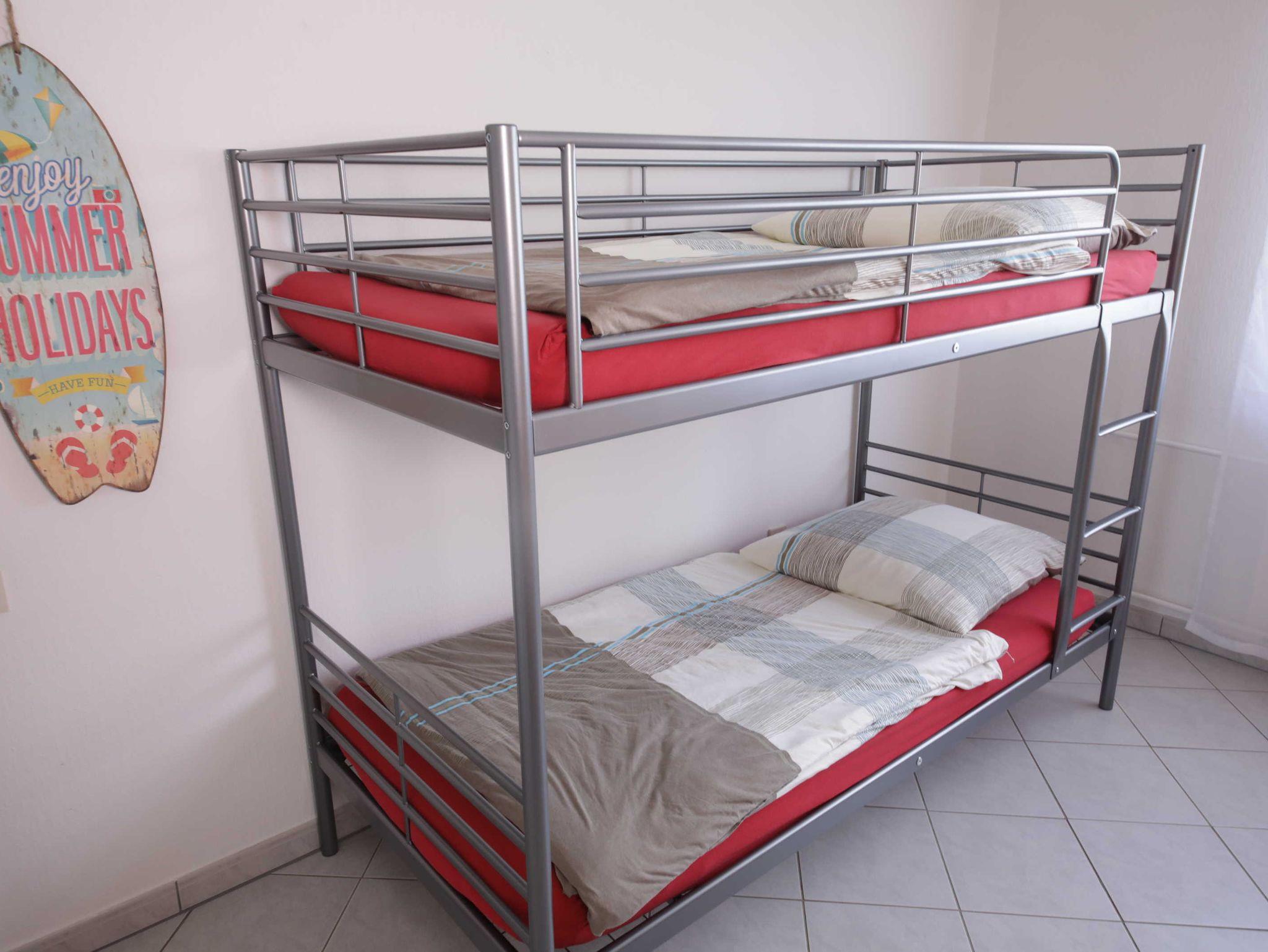 Das gemütliche und ruhige Schlafzimmer ist mit einem Doppelbett (1,80m x 2,00m), einem Doppel-Stockbett sowie einem großen Kleiderschrank ausgestattet. Im zweiten Schlafzimmer befindet sich ebenfalls ein Doppelbett (1,80m x 2,00m), ein kleiner Kleiderschrank sowie zusätzlich noch ein Schreibtisch. Die Schlafbereiche ist sehr ruhig.