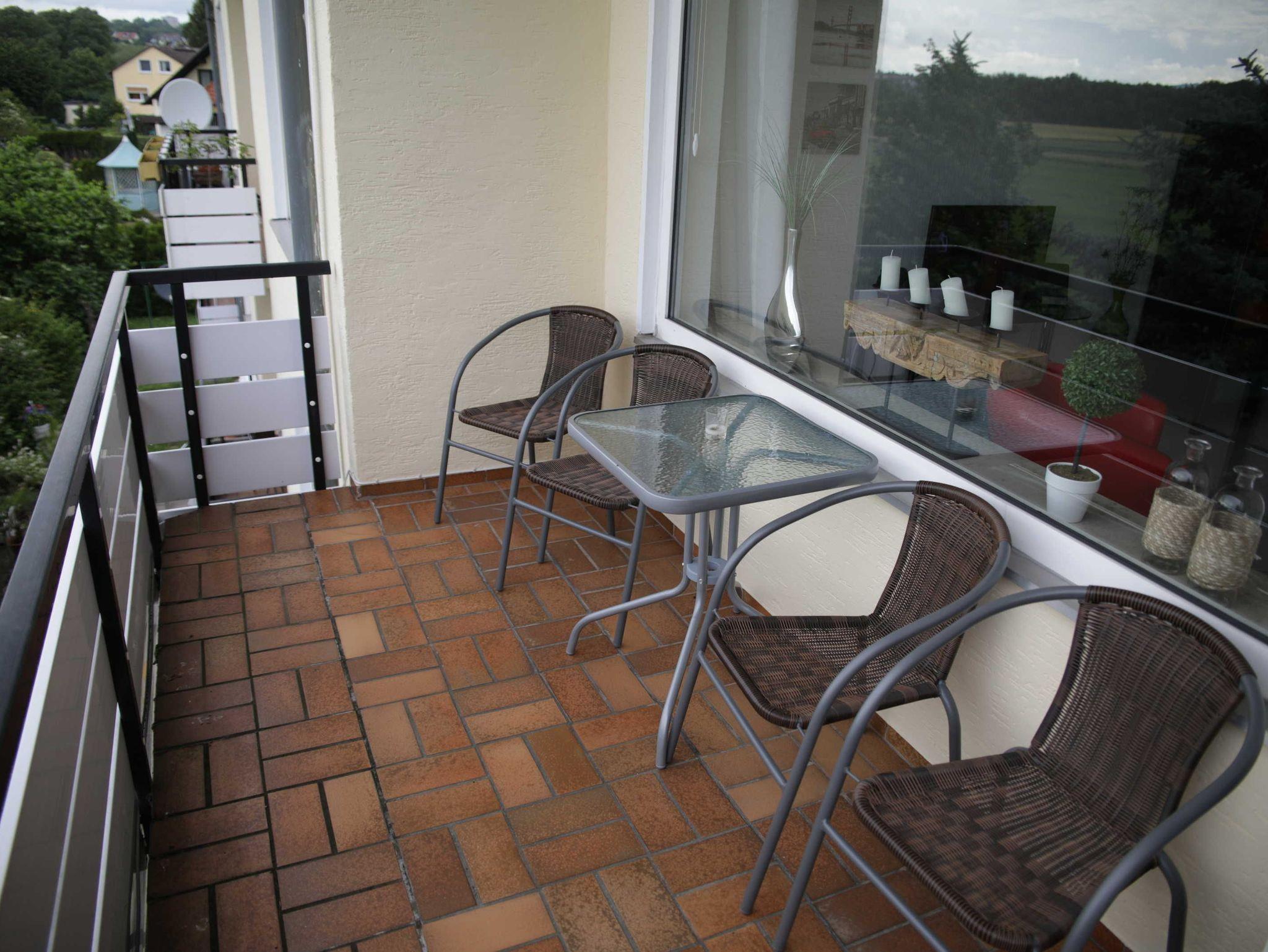 Der große Süd-Balkon besticht durch seinen Blick auf die weitläufige Fulda-Aue sowie auf den Herkules (Unesco-Weltkulturerbe). Mit Tisch und Stühlen lädt er zum Verweilen in der Sonne ein.