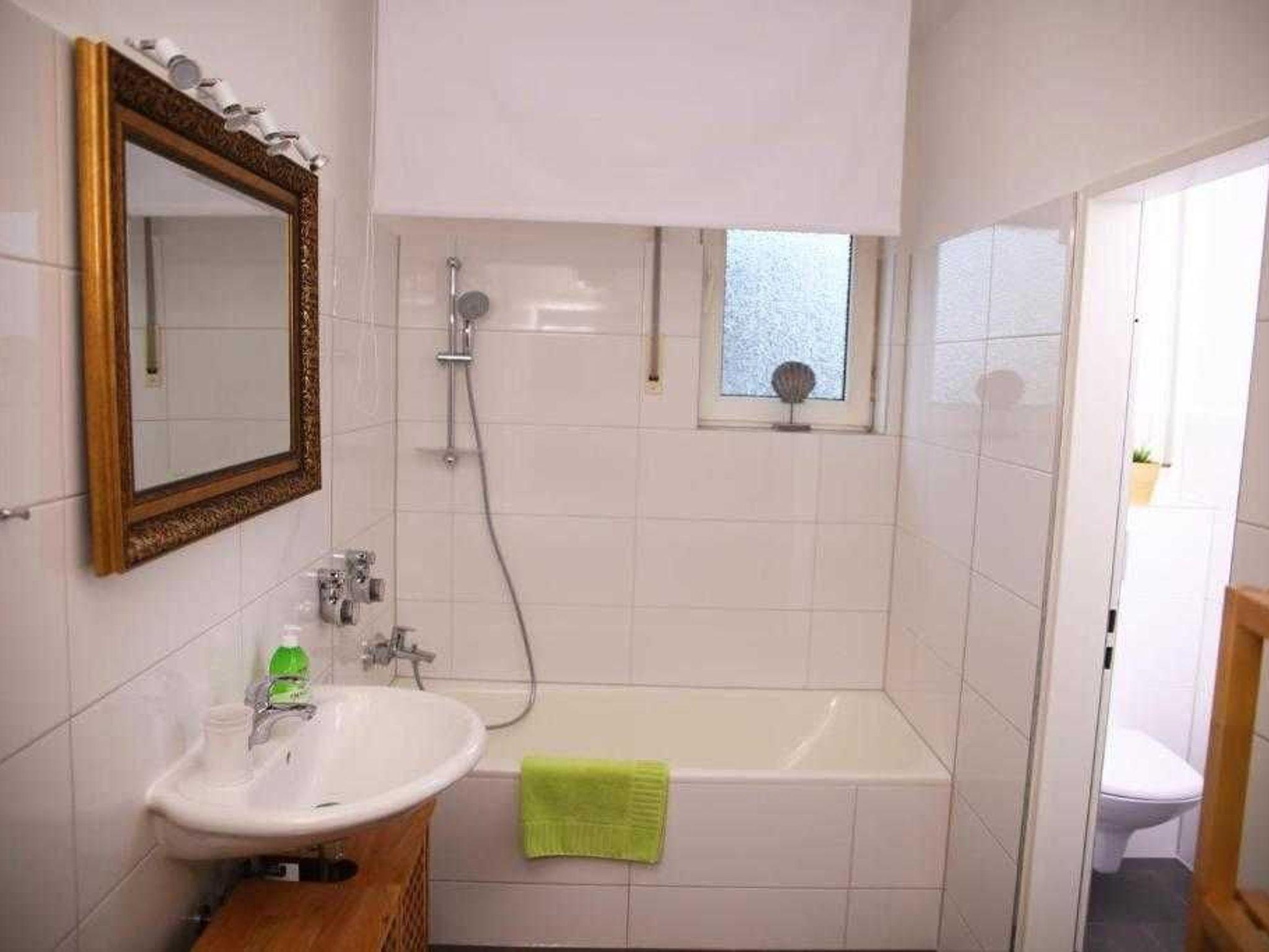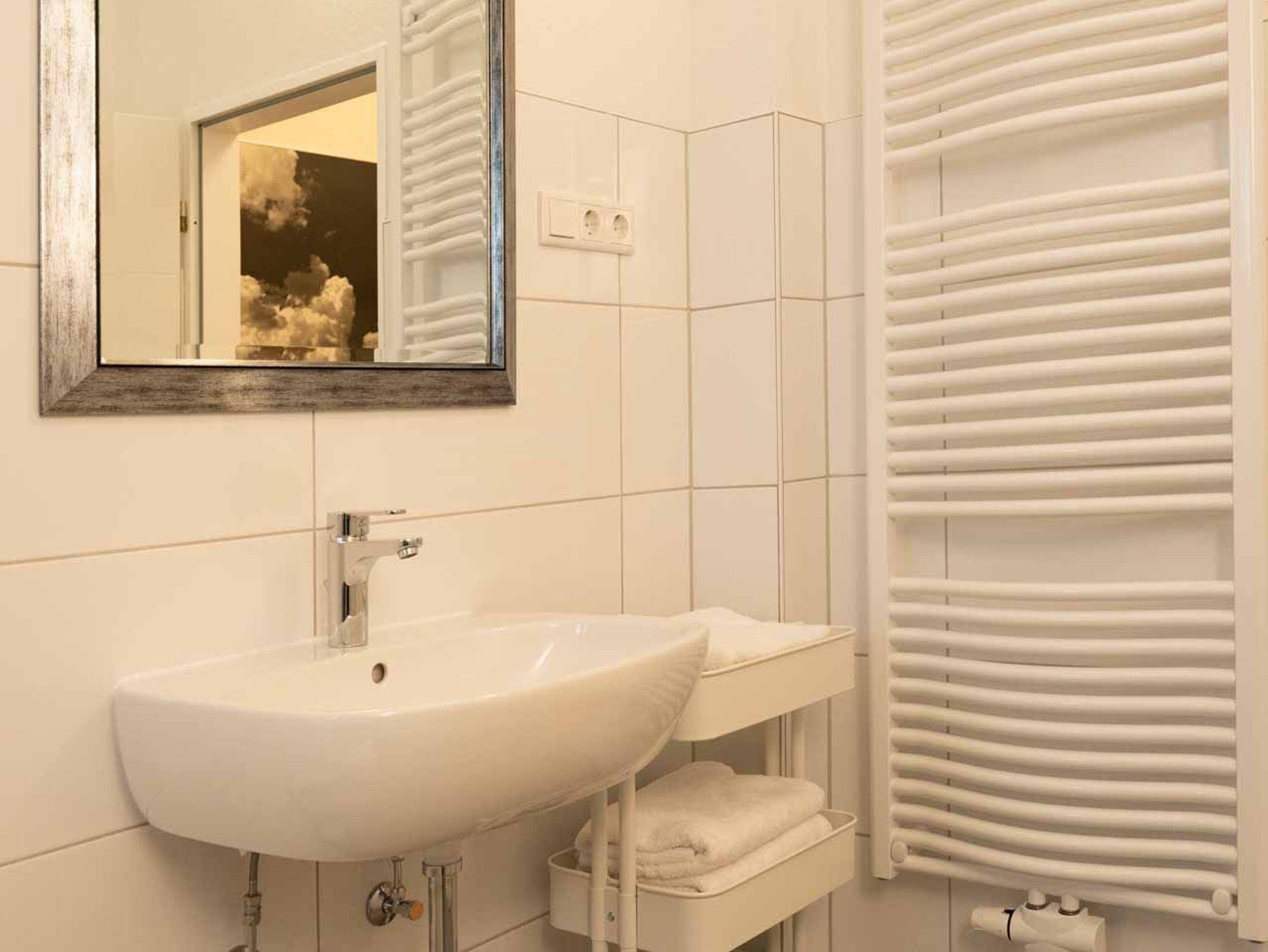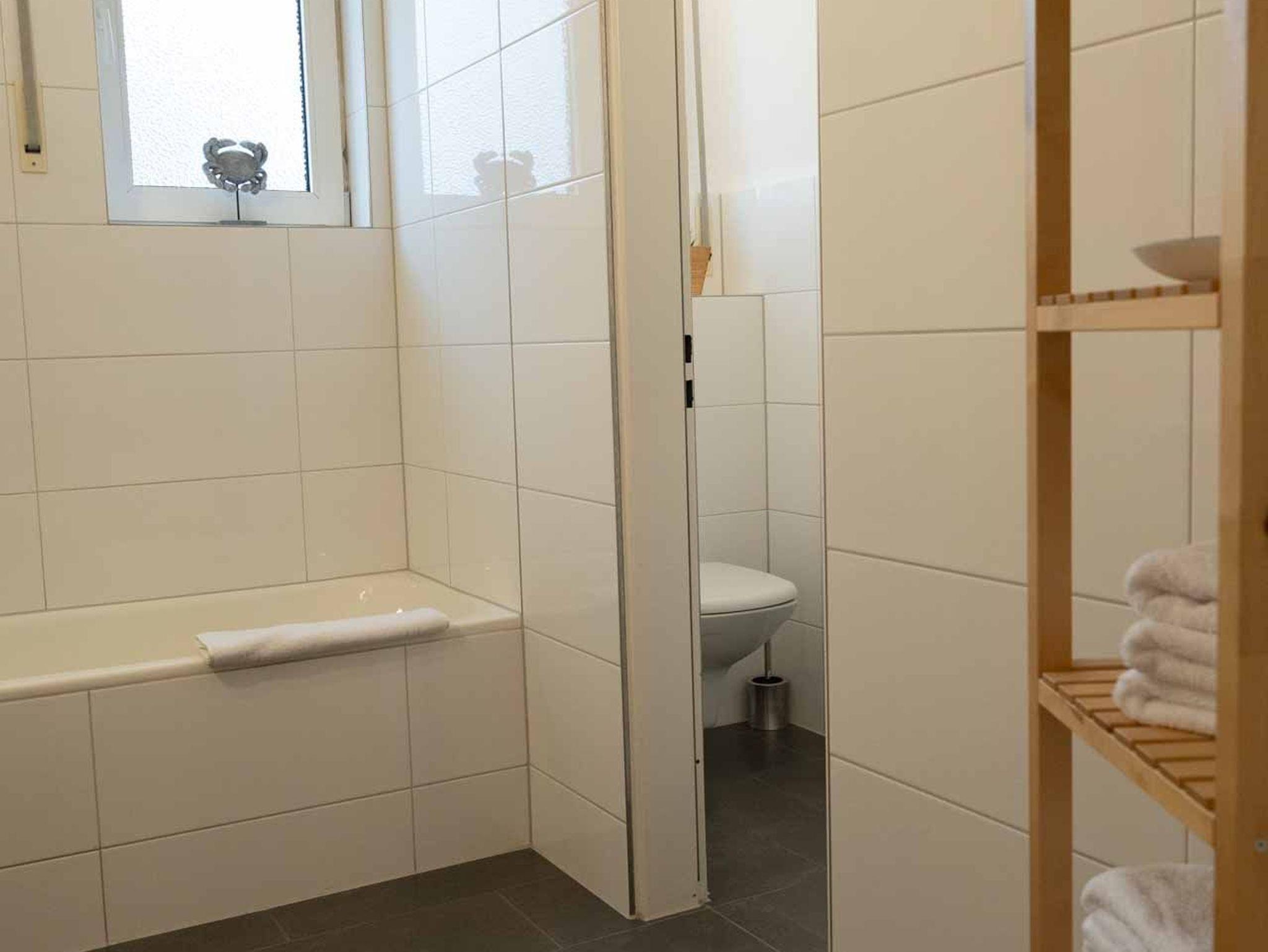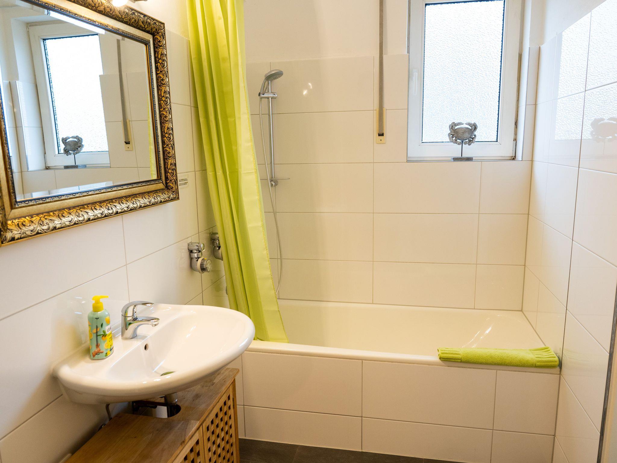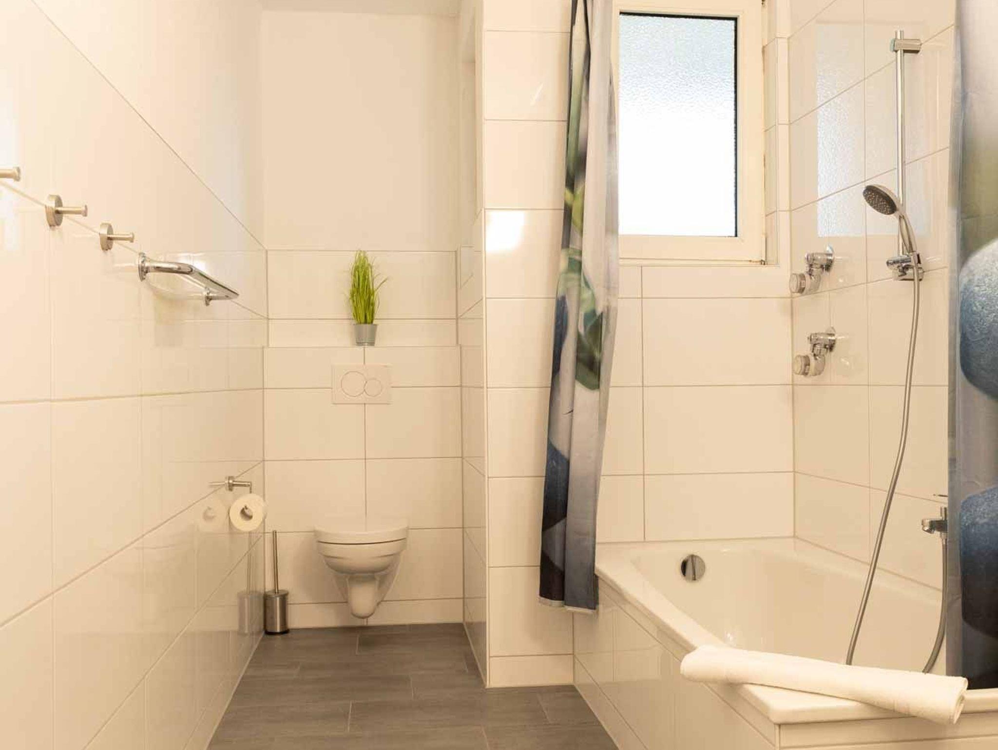 moderne Bad u.a. mit Dusche/Badewanne und WC.