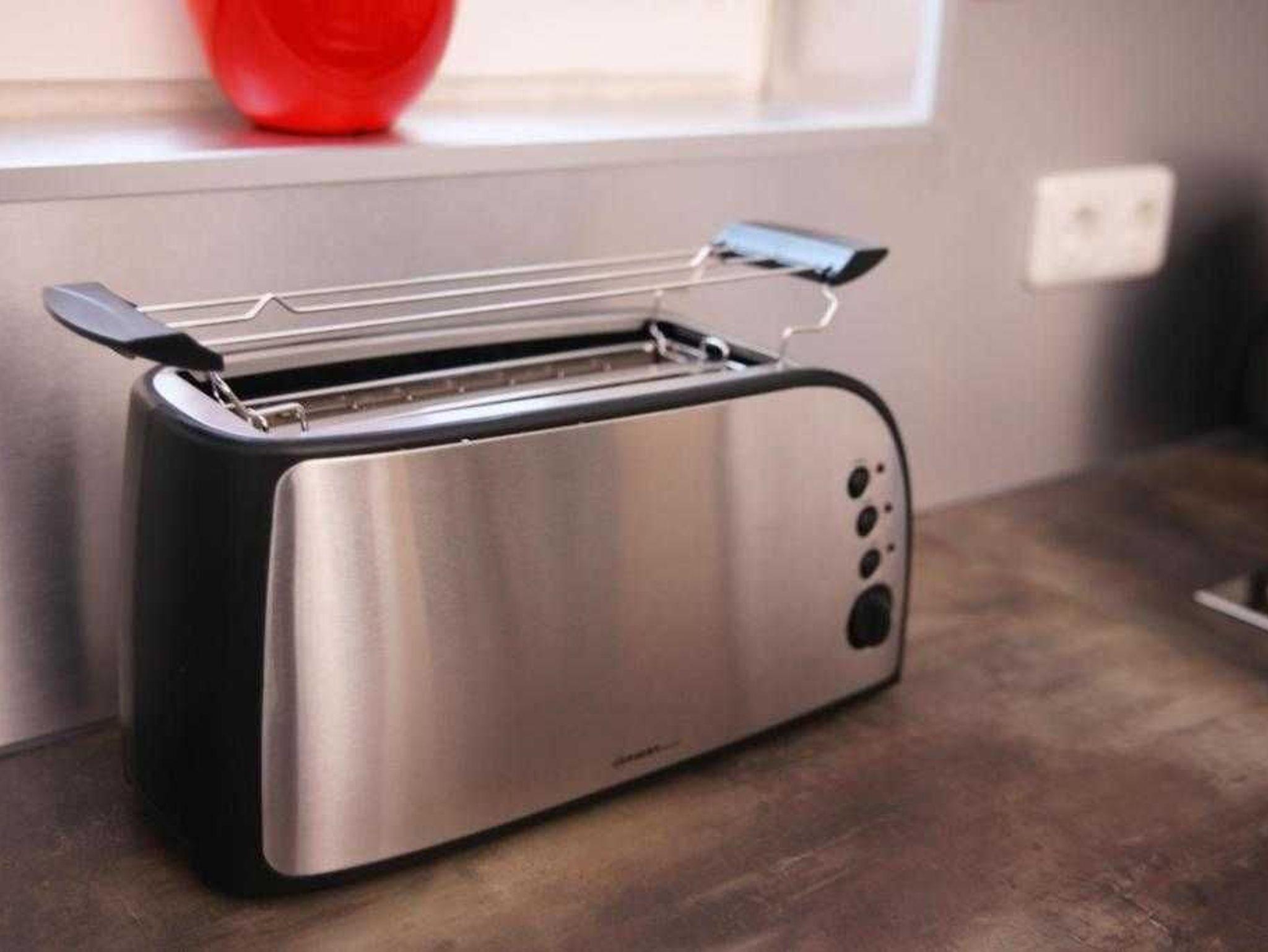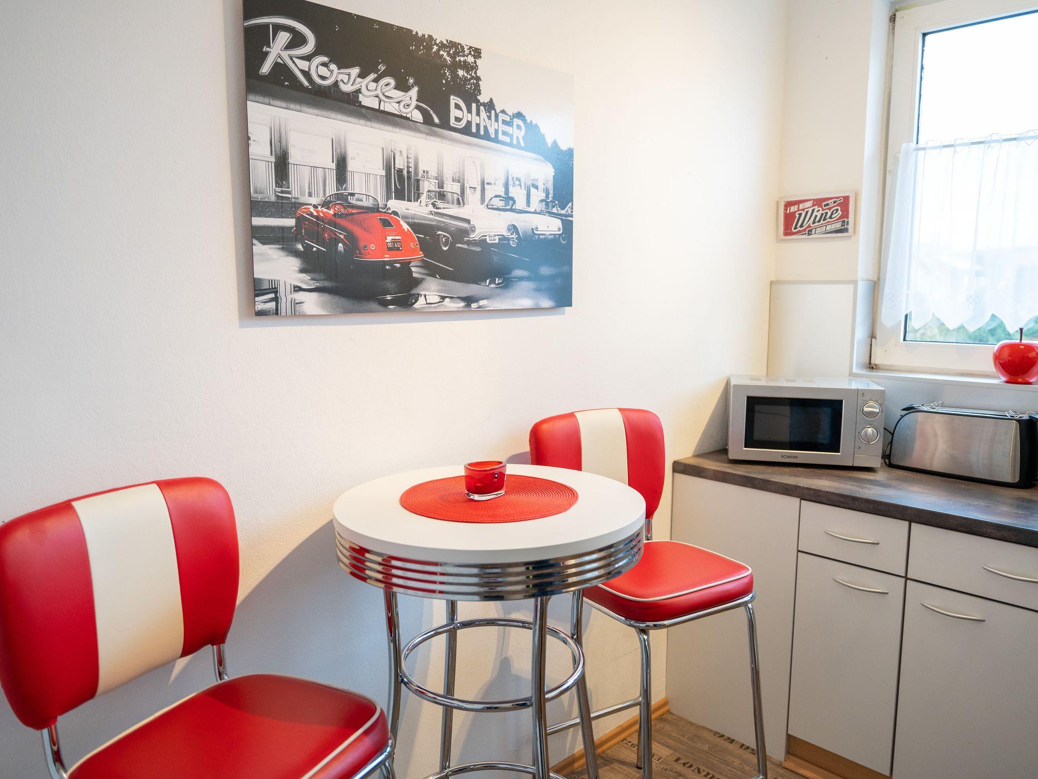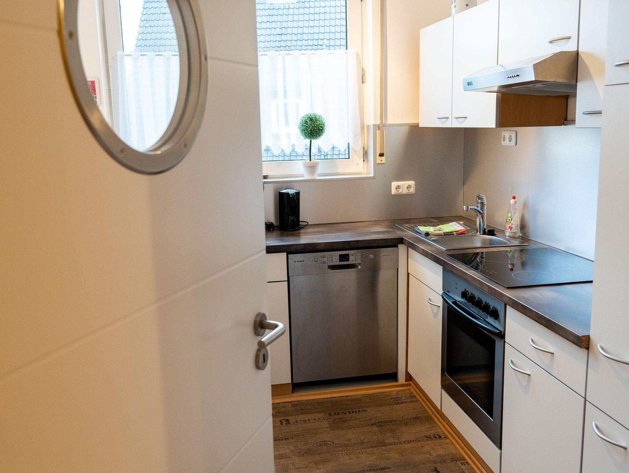 Die Küche ist modern und verfügt außerdem noch über einen Bistro-Tisch mit 2 Hockern.