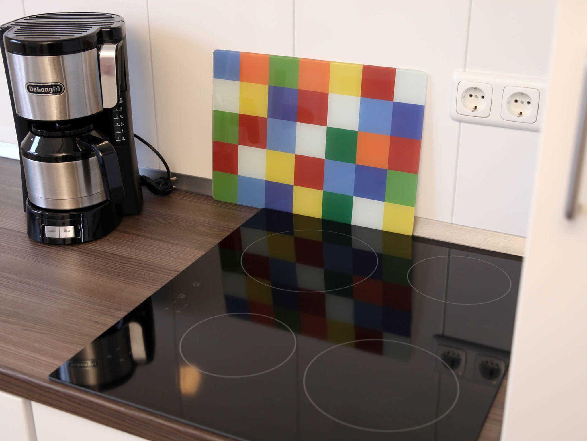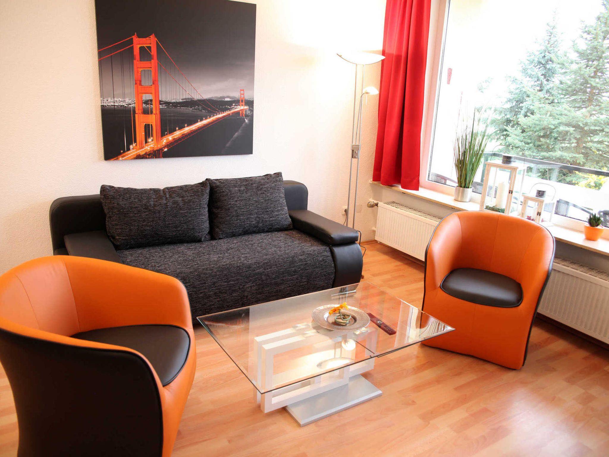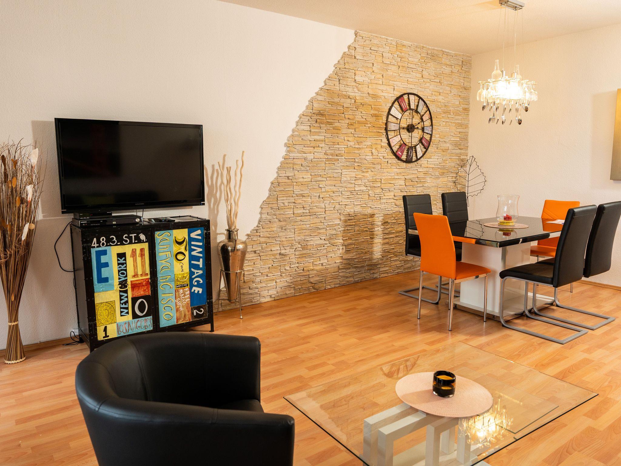 Das Wohnzimmer ist mit einer bequemen, ausziehbaren Schlafcouch mit Federkern ausgestattet, mit Flachbild-TV, DVD-Player und Hifi-Anlage. Des weiteren befindet sich hier ein sehr geräumiger Essbereich. Die Küche ist mit einer modernen Küchenzeile ausgestattet, das moderne Bad u.a. mit Dusche und separatem WC.