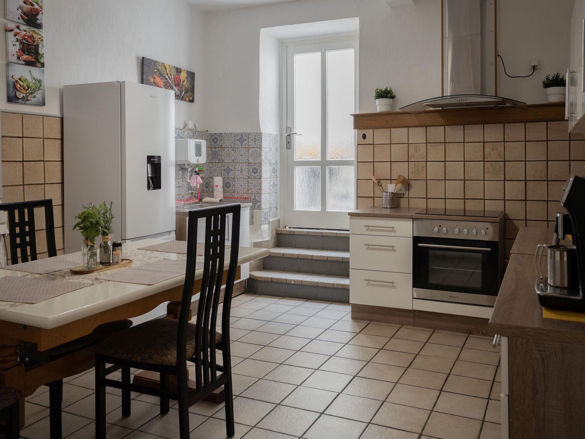 Die großzügige Küche begeistert mit moderner Ausstattung – inklusive großem Kühlschrank, Herd, Kaffeemaschine und gemütlichem Essbereich (keine Geschirrspülmaschine). Ideal für Kochabende mit der Familie oder Freunden. Kleine liebevolle Details und mediterrane Fliesen sorgen für ein heimeliges Flair.