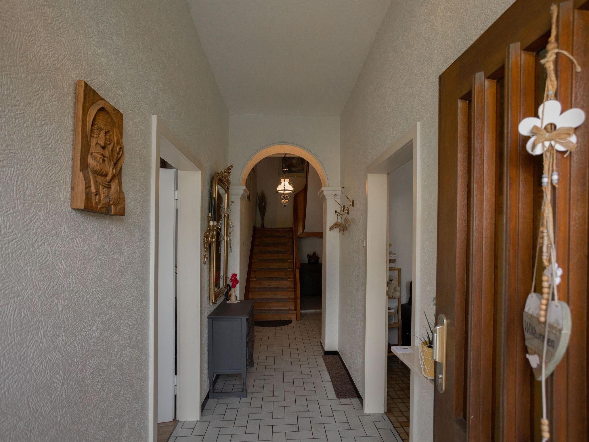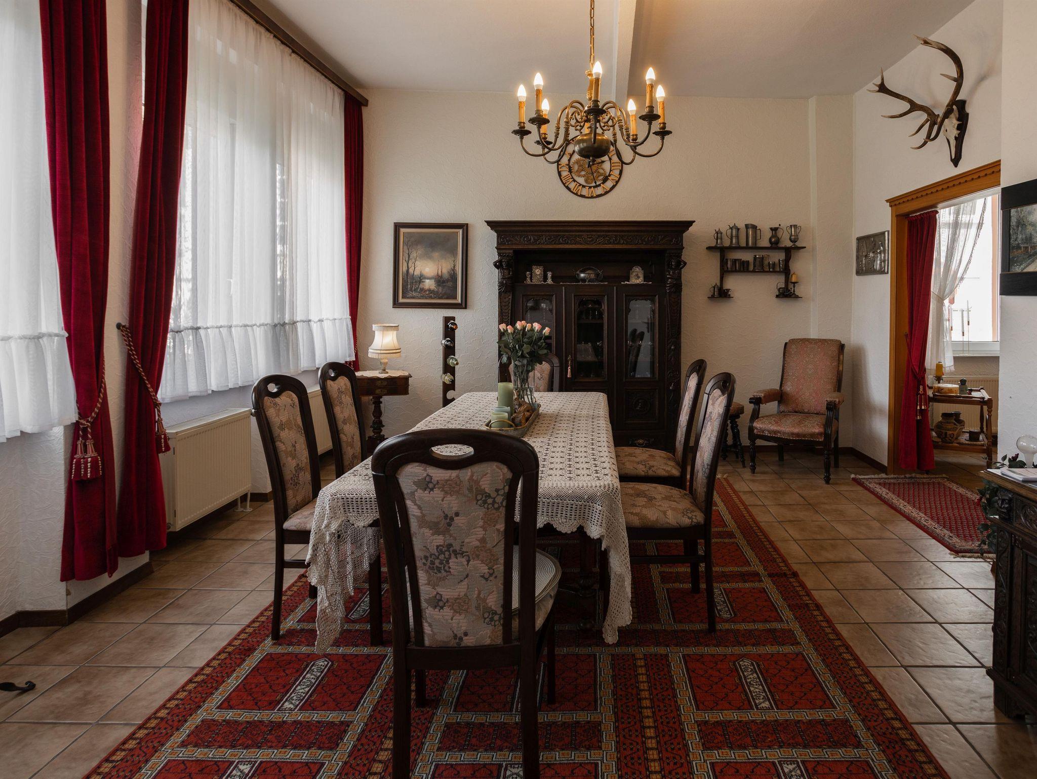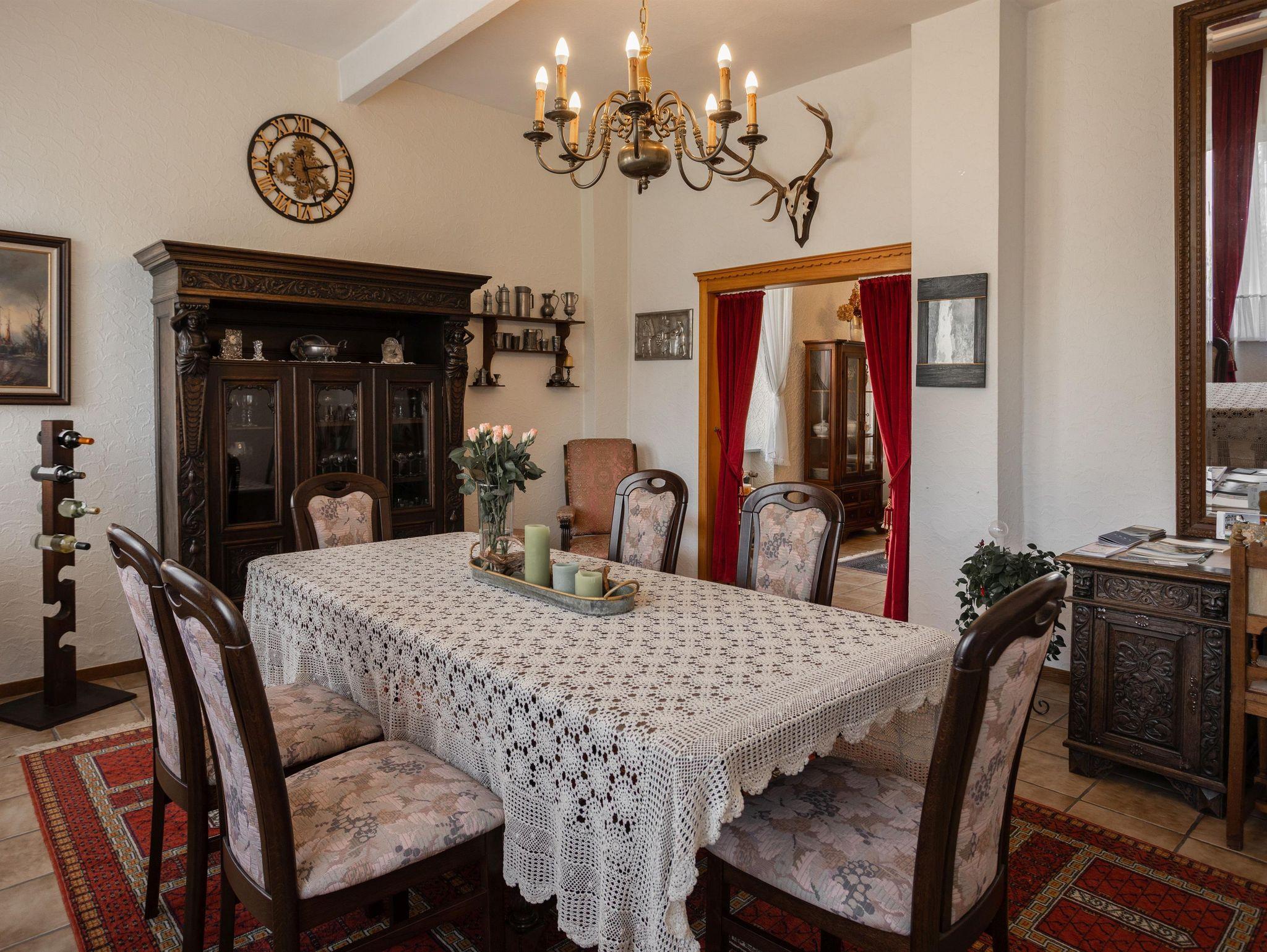 Das Esszimmer besticht durch seinen traditionellen Charakter mit antikem Mobiliar, Kronleuchter und dekorativen Sammlerobjekten. Der perfekte Ort für ausgedehnte Mahlzeiten oder gesellige Abende mit einem Glas Moselwein.