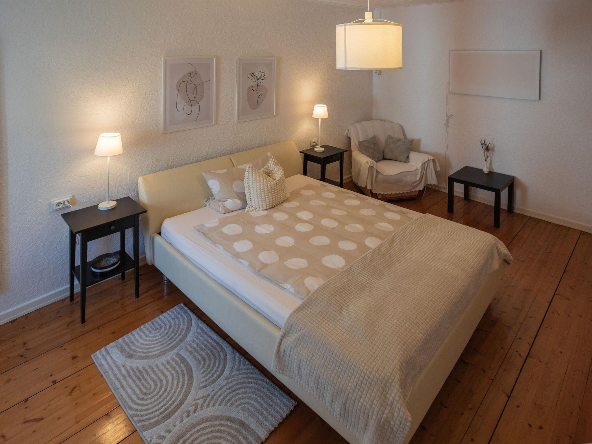 Das Haus bietet Ihnen im Obergeschoss 3 helle, freundliche Schlafzimmer mit bequemen Betten und stilvollem Interieur. Hochwertige Bettwäsche, kuschelige Kissen und geschmackvolle Wanddekorationen sorgen für ein behagliches Ambiente und erholsamen Schlaf.