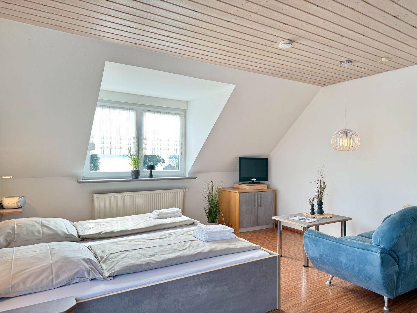 Der kombinierte Wohn- und Schlafraum ist komfortabel und praktisch gestaltet. Hier erwartet Sie ein bequemes Doppelbett, ein geräumiger Kleiderschrank, eine gemütliche Sitzgelegenheit mit Couch und Tisch sowie ein Farb-Sat-TV und ein anwählbares Telefon. Die integrierte Pantryküche ist mit einem 2-Plattenherd, Kühlschrank, Kaffeemaschine (Pads), Wasserkocher, Toaster, Eierkocher und allem nötigen Kochzubehör ausgestattet – ideal für kleinere Mahlzeiten oder ein Frühstück mit Aussicht.