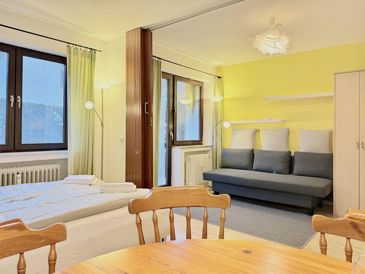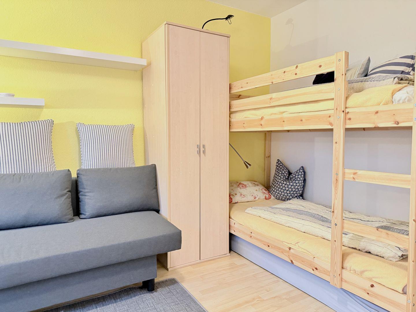 Der kombinierte Wohn- und Schlafbereich ist behaglich eingerichtet und verfügt über ein gemütliches Schlaf-Sofa sowie ein Etagenbett für die Kinder. Bitte beachten Sie, dass bewusst kein TV vorhanden ist – Bücher, Gesellschaftsspiele und kostenfreies WLAN bieten dennoch vielseitige Unterhaltung.