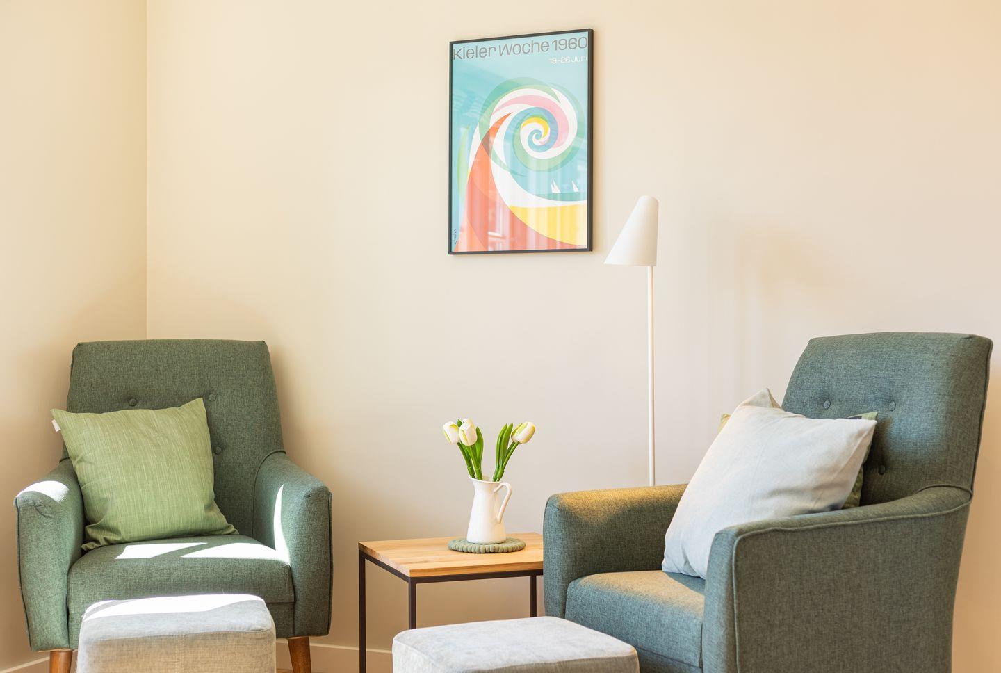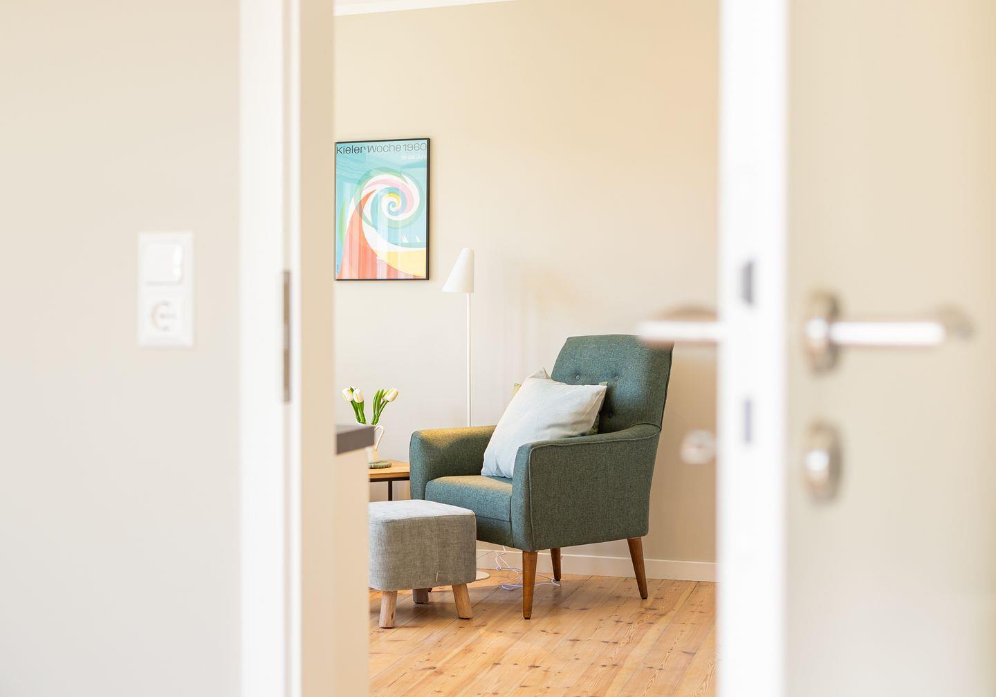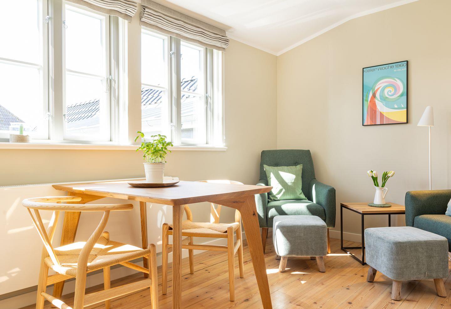 Diese 43qm² große Wohnung 2 liegt im ersten Obergeschoß des Hauses. Sie ist hell und geschmackvoll eingerichtet und wird Ihnen vom ersten Tag an Erholung bieten. Diese elegant, im nordischen Stil gestaltete Ferienwohnung ist ein optimaler Ausgangspunkt für Ihre Aktivitäten. Sie ist mit ihren skandinavischen und hochwertigen Möbeln die Wohlfühloase Ihrer Amrumzeit. Hier erwartet Sie ein Schlafzimmer mit einem 1,60m großem Boxspringbett. Im Wohn- und Essbereich ist eine Küche integriert. Die Küche ist mit allen Utensilien ausgestattet. Der Wohnbereich mit TV und zwei Sesseln lädt zu erholsamen Stunden ein.