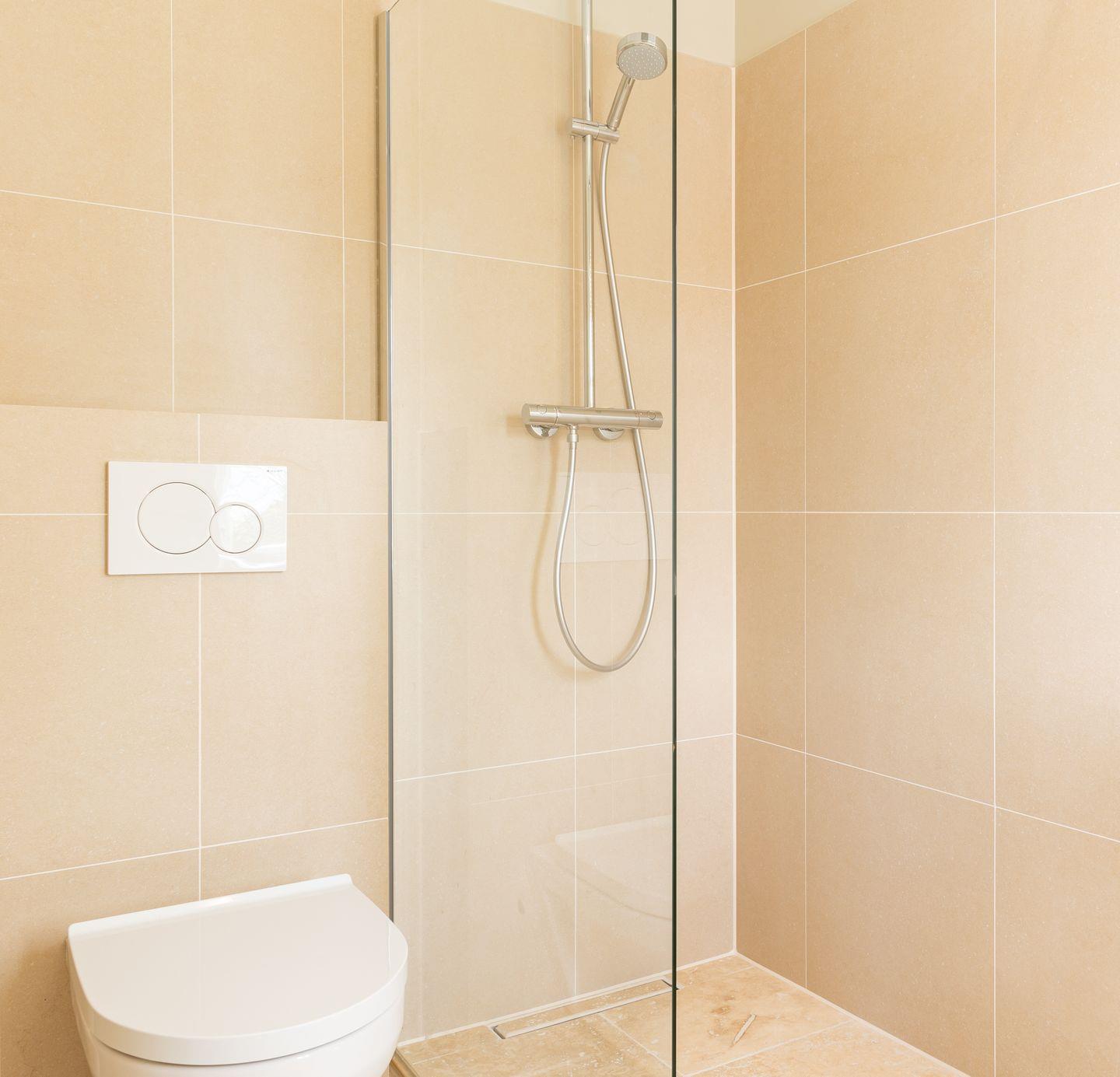 Das neue Bad ist mit hellem Naturstein gefliest. Die offene bodentiefe Regendusche ist begehbar und hat eine gläserne Seitenwand.