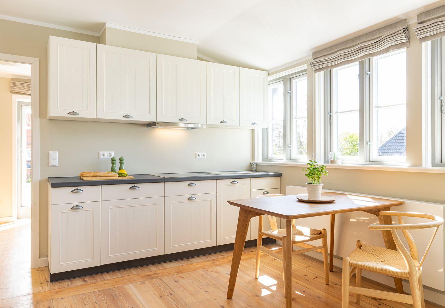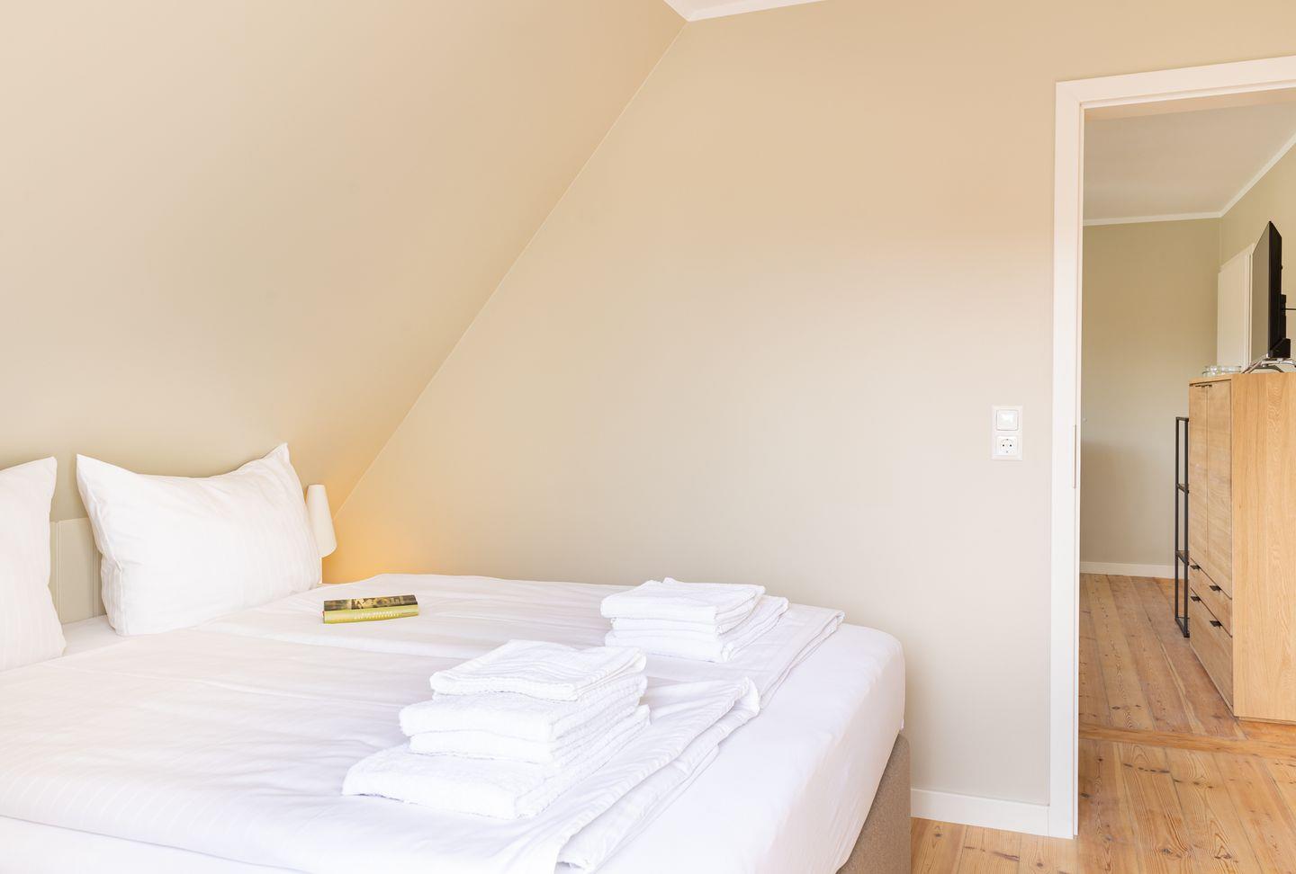 Diese 43qm² große Wohnung 2 liegt im ersten OG. Sie ist hell und geschmackvoll eingerichtet und bietet Ihnen vom ersten Tag an Erholung. Sie ist mit skandinavischen und hochwertigen Möbeln die Wohlfühloase Ihrer Amrumzeit. Im Wohn- und Essbereich ist eine Küche integriert. Der Wohnbereich mit TV und zwei Sesseln lädt zu erholsamen Stunden ein. Das Schlafzimmer ist mit einem 1,60 m breiten Boxspringbett ausgestattet.
