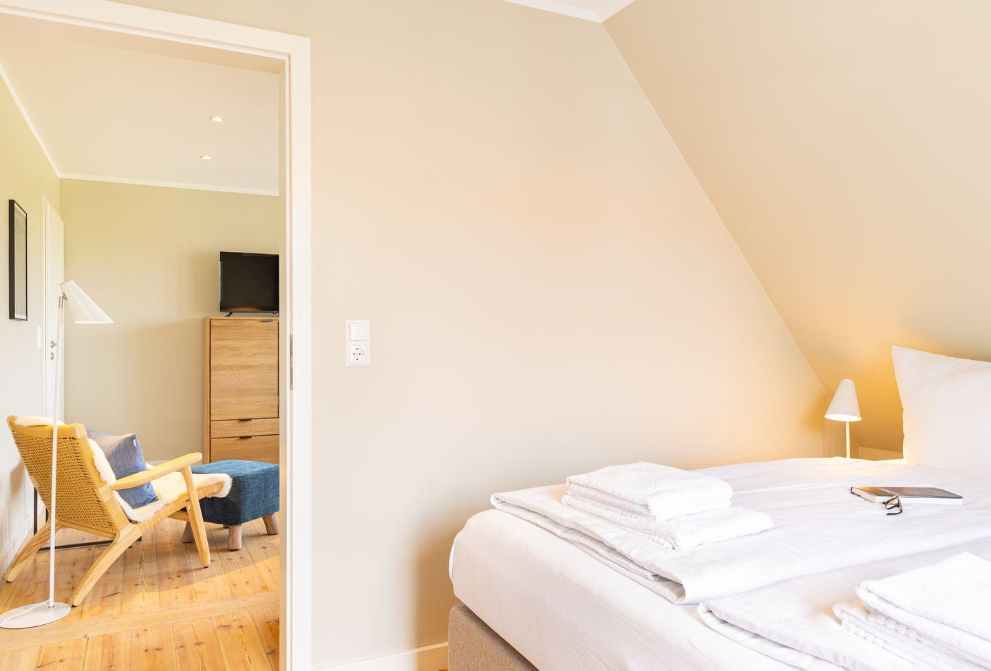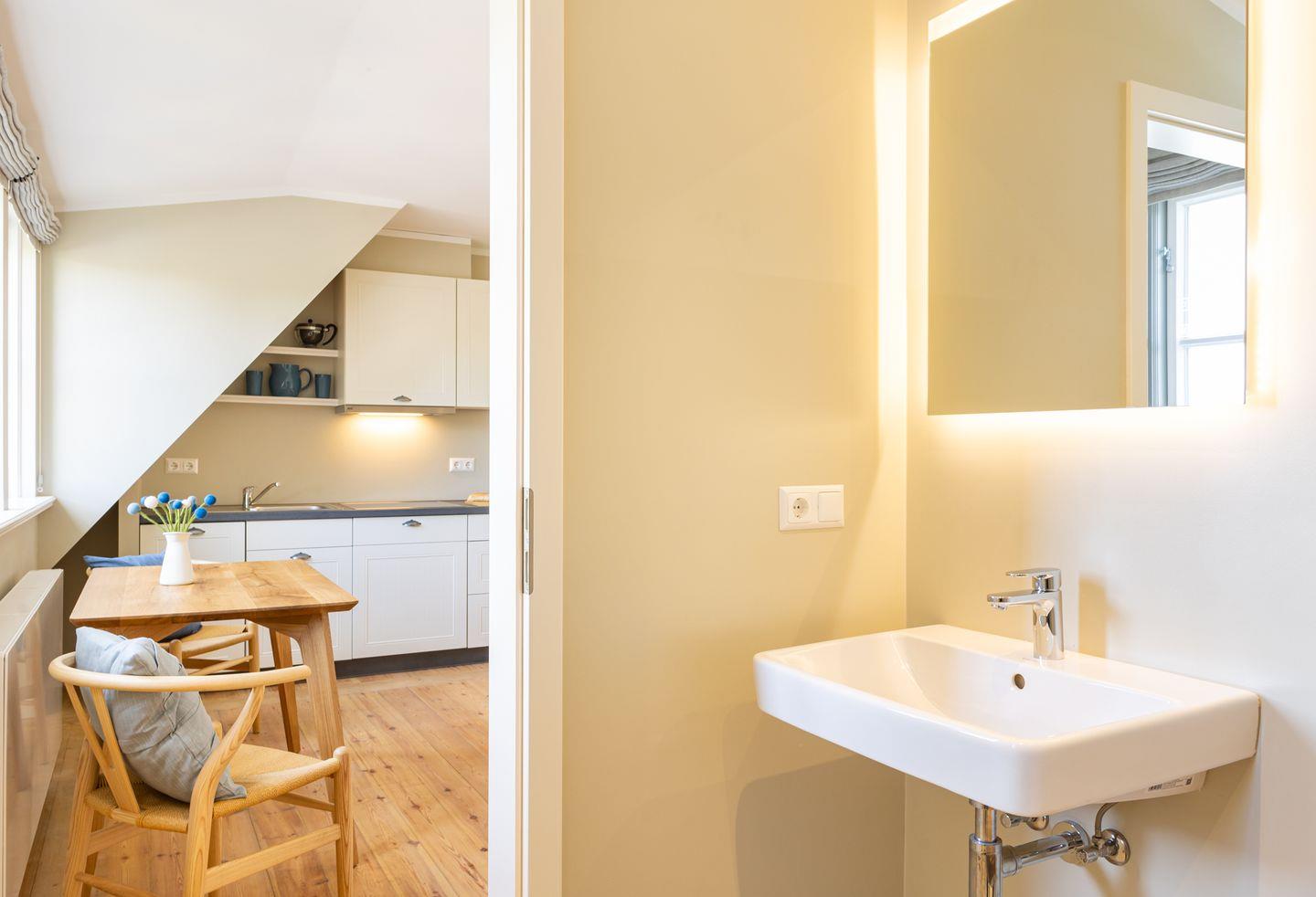Diese 43qm² große Wohnung 3 liegt im ersten OG. Sie ist hell und geschmackvoll eingerichtet und bietet Ihnen vom ersten Tag an Erholung. Sie ist mit skandinavischen und hochwertigen Möbeln die Wohlfühloase Ihrer Amrumzeit. Im Wohn- und Essbereich ist eine Küche integriert. Der Wohnbereich mit TV und zwei Sesseln lädt zu erholsamen Stunden ein. Das Schlafzimmer ist mit einem 1,60 m breiten Boxspringbett ausgestattet.