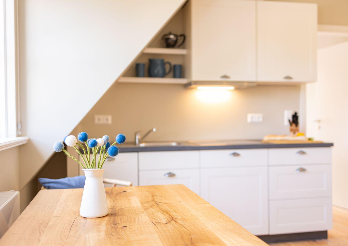 Diese 43qm² große Wohnung 3 liegt im ersten Obergeschoß des Hauses. Sie ist hell und geschmackvoll eingerichtet und wird Ihnen vom ersten Tag an Erholung bieten. Diese elegant, im nordischen Stil gestaltete Ferienwohnung ist ein optimaler Ausgangspunkt für Ihre Aktivitäten. Sie ist mit ihren skandinavischen und hochwertigen Möbeln die Wohlfühloase Ihrer Amrumzeit. Hier erwartet Sie ein Schlafzimmer mit einem 1,60m großem Boxspringbett. Im Wohn- und Essbereich ist eine Küche integriert. Die Küche ist mit allen Utensilien ausgestattet. Der Wohnbereich mit TV und zwei Sesseln lädt zu erholsamen Stunden ein.