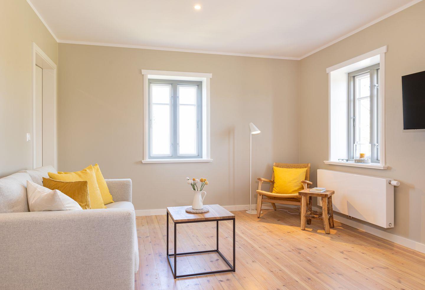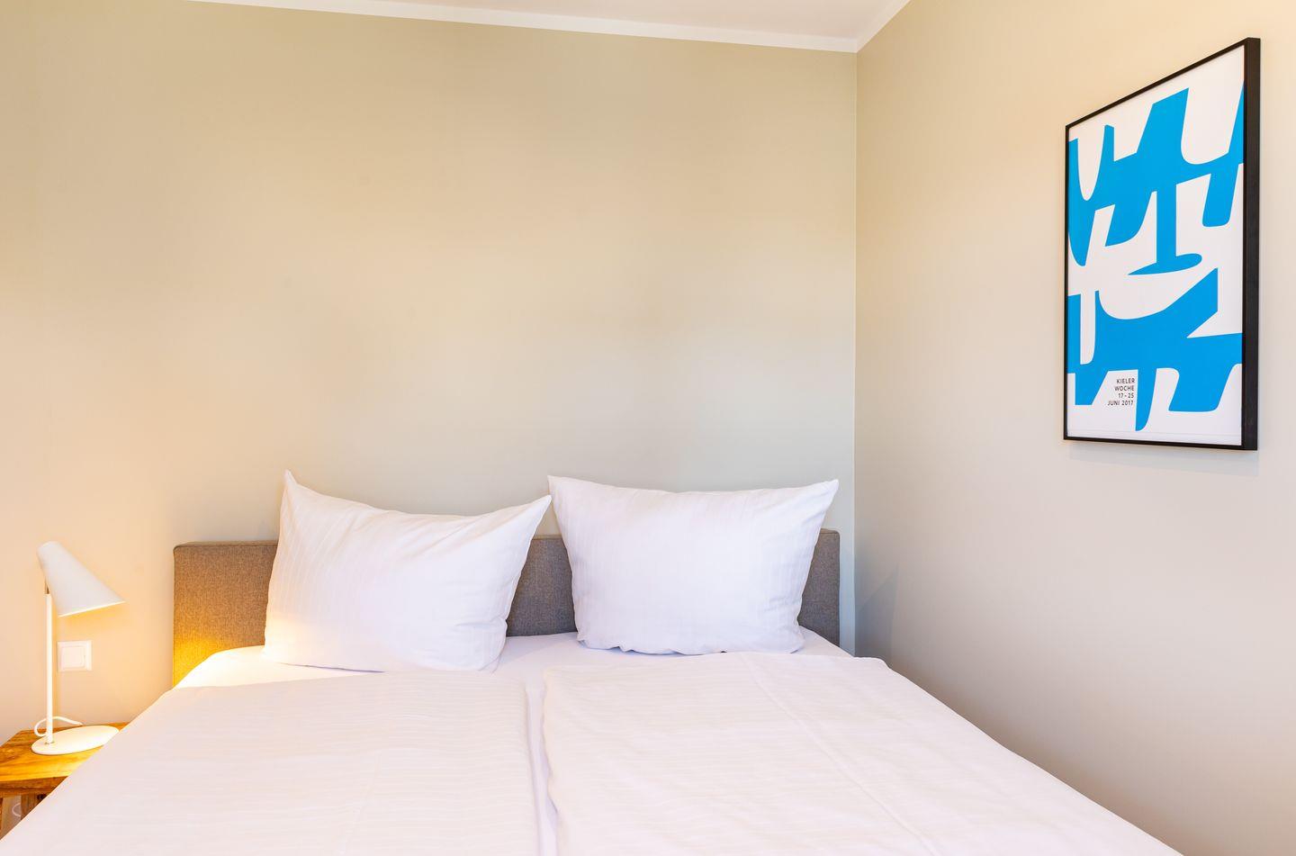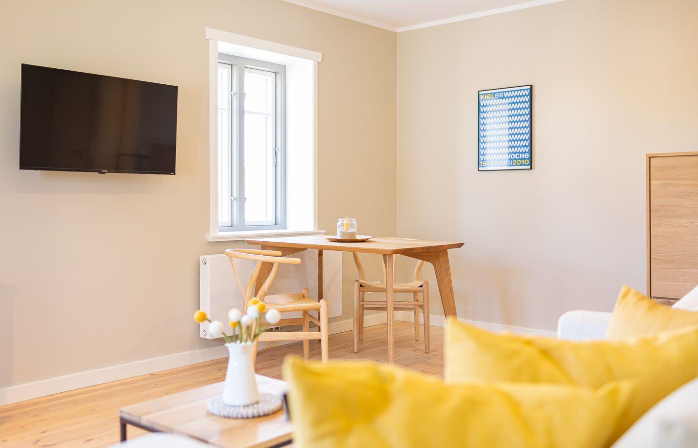 Diese 40qm² große Wohnung 4 liegt im ersten OG. Sie ist hell und geschmackvoll eingerichtet und bietet Ihnen vom ersten Tag an Erholung. Sie ist mit skandinavischen und hochwertigen Möbeln die Wohlfühloase Ihrer Amrumzeit. Im Wohn- und Essbereich ist eine Küche integriert. Der Wohnbereich mit TV und einem Sessel lädt zu erholsamen Stunden ein. Das Schlafzimmer ist mit einem 1,60 m breiten Boxspringbett ausgestattet.