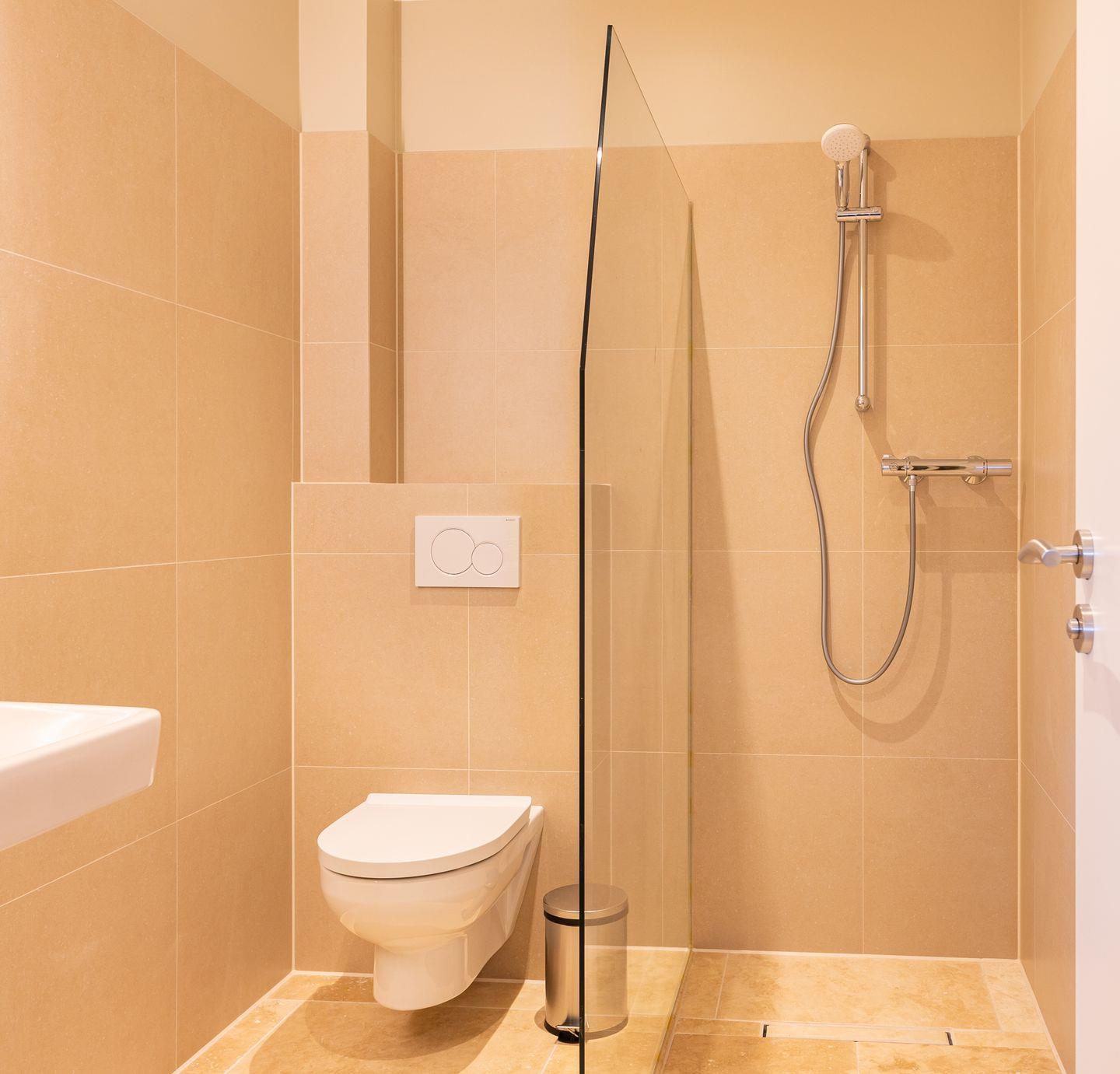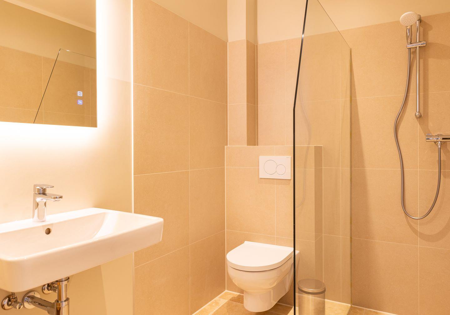 Das neue Bad ist mit hellem Naturstein gefliest. Die offene bodentiefe Dusche ist begehbar und hat eine gläserne Seitenwand.