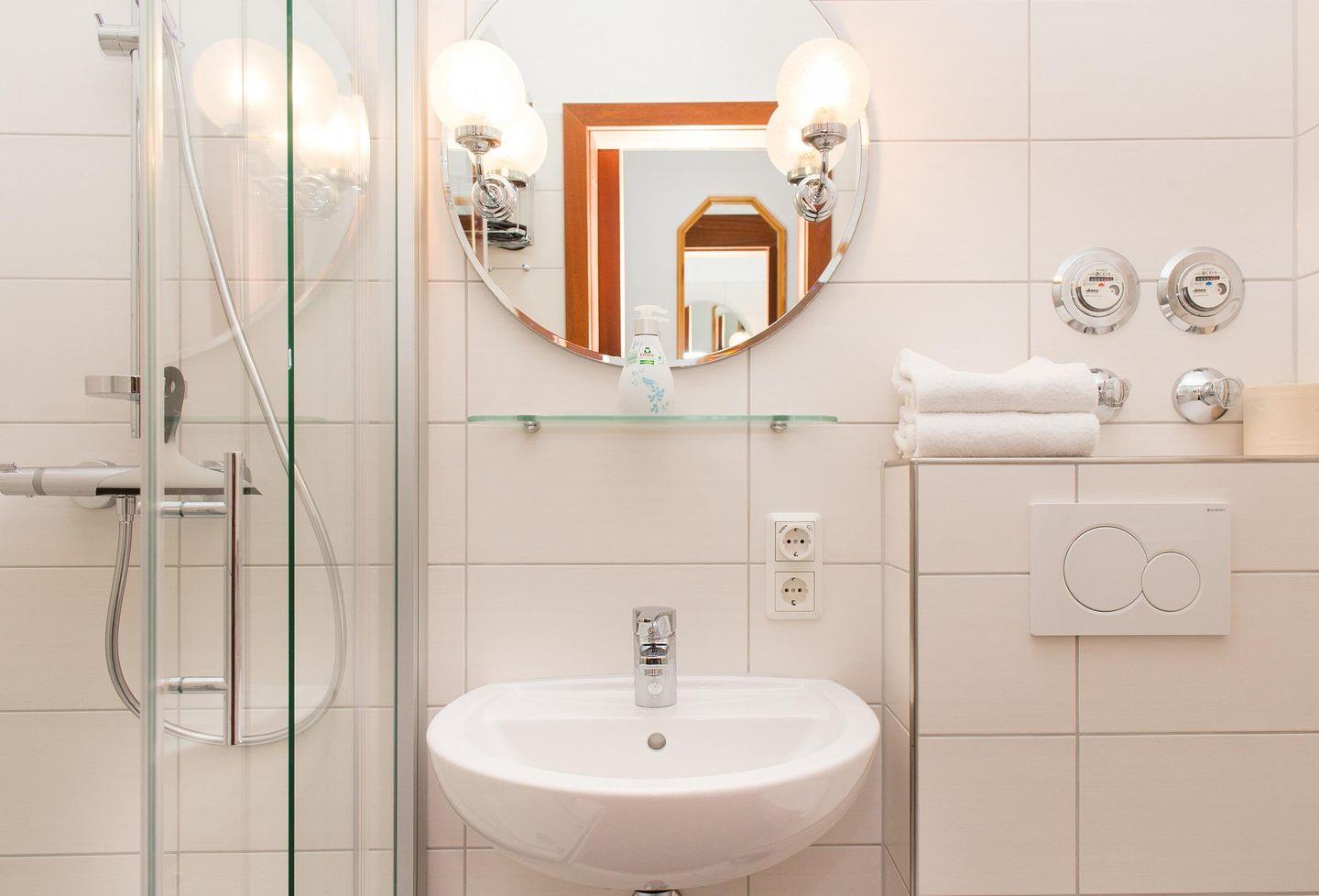 Das Badezimmer ist mit einer Dusche, einem WC und einen Waschbecken mit Spiegel ausgestattet.