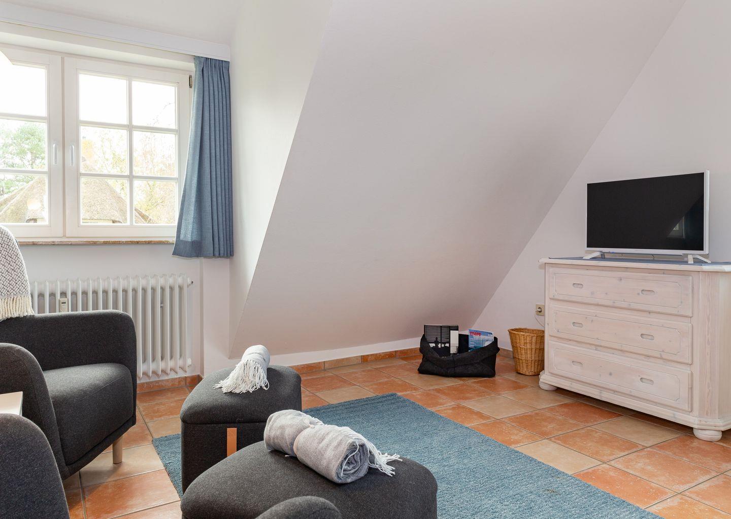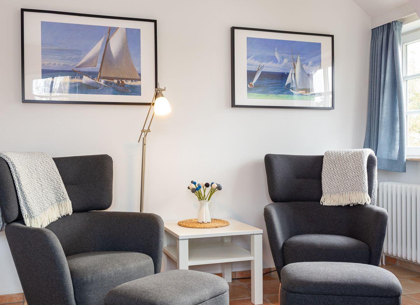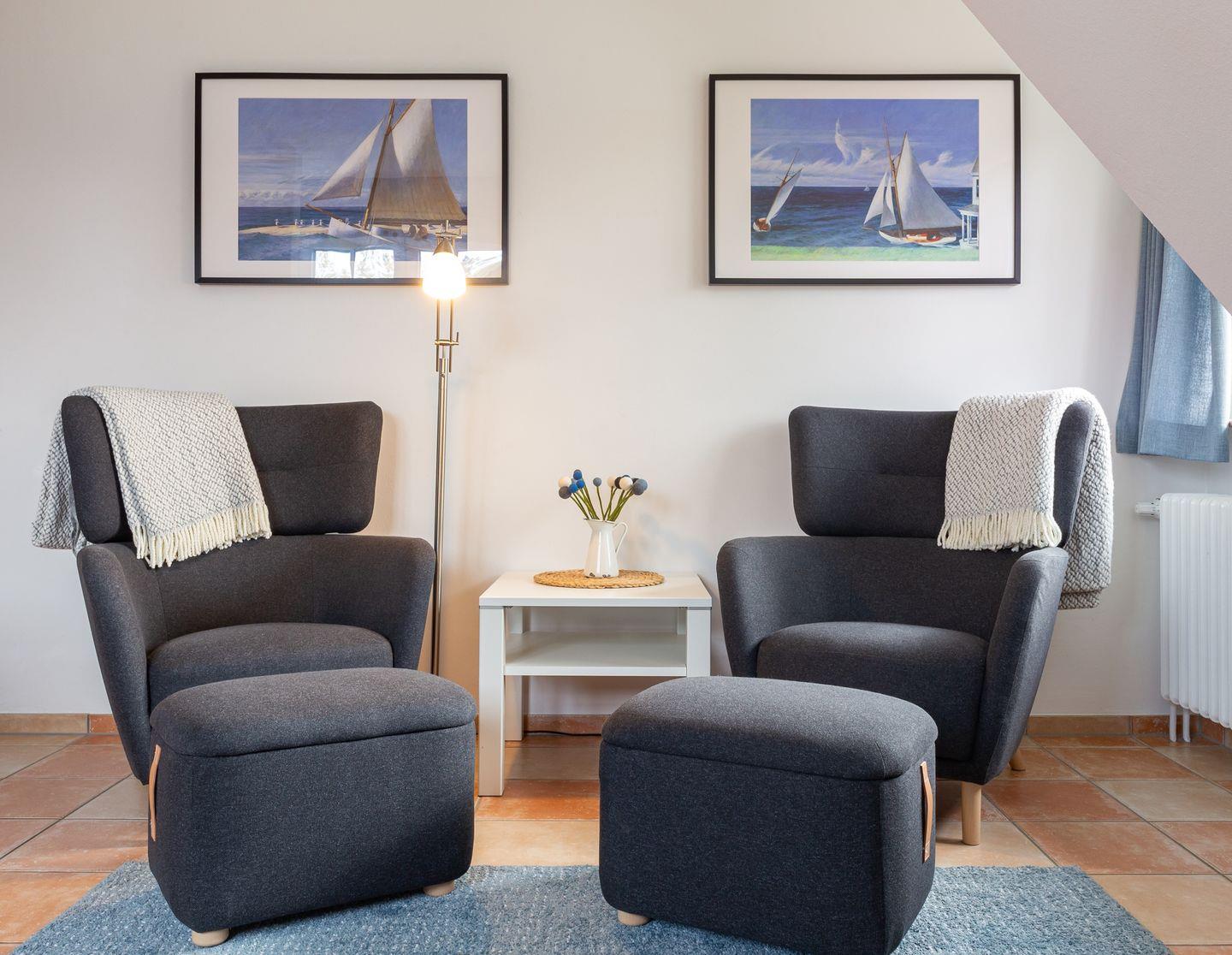 Das Wohnzimmer ist mit zwei Sesseln mit Ablagen, einem Essplatz und einem TV eingerichtet.