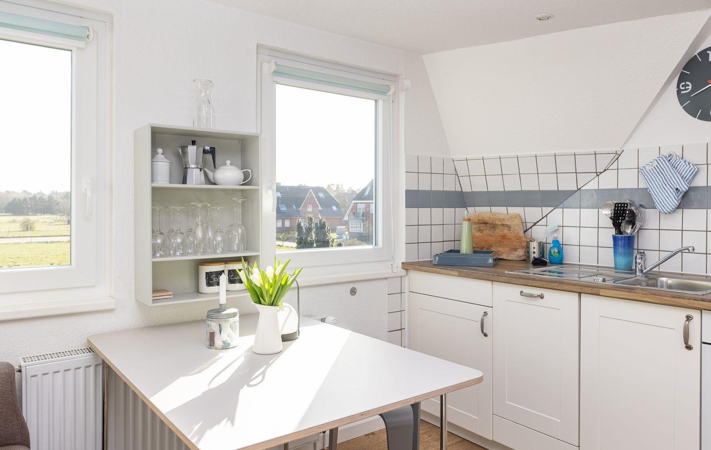 Die helle Küche ist mit einem Backofen, einem 4-Platten-Cerankochfeld, einer Spülmaschine, einem Kühlschrank mit Gefrierfach, Wasserkocher, Toaster, Kaffeemaschine und Geschirr & Kochutensilien ausgestattet. Vom Esstisch aus genießen Sie den weiten Blick über die Insel. Das gemütliche Schlafzimmer ist mit einem Doppelbett in einer Breite von 160 cm möbliert.