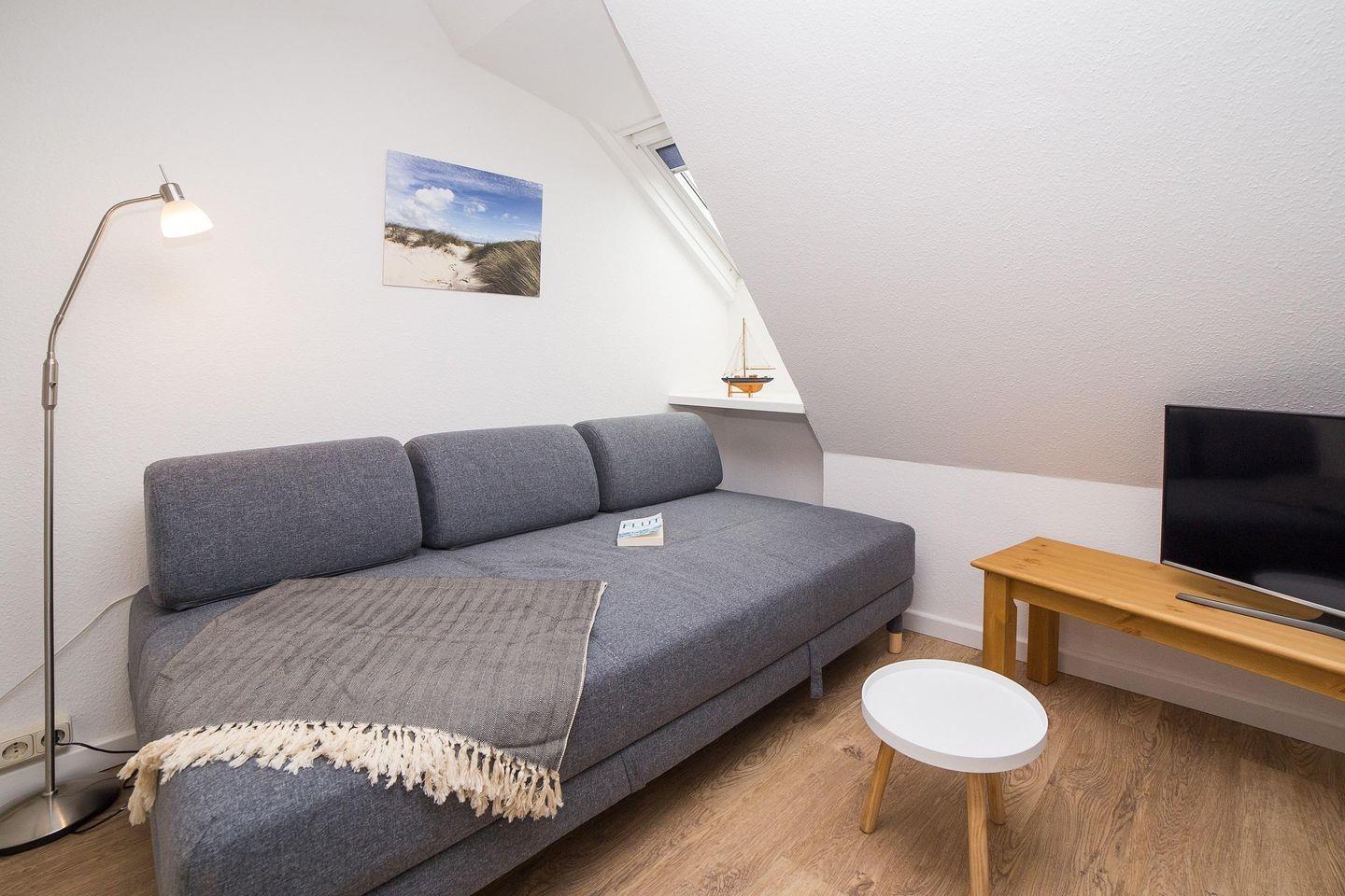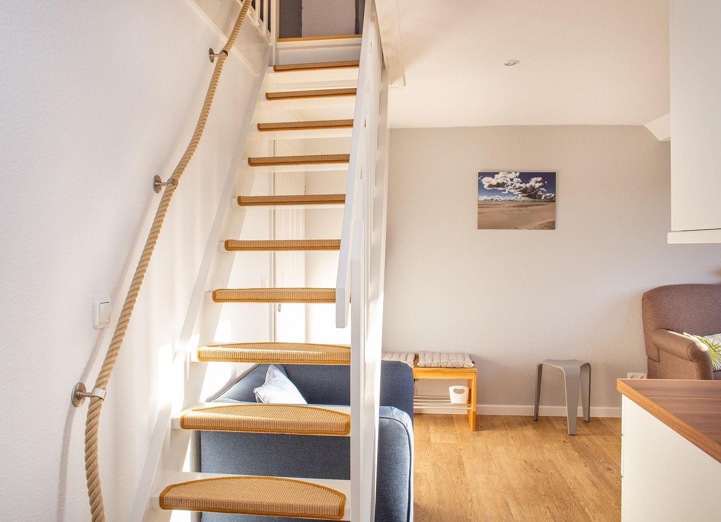 Das Duschbad mit WC hat ein Fenster. Ein Fön ist ebenfalls vorhanden. Über eine Treppe ist der Spitzboden unter dem Dachgiebel zu erreichen. An einem kleinen Schreibtisch können Sie Ihre Urlaubspost schreiben. In der Wohnung wurde eine Vinyl-Kork Boden verlegt.