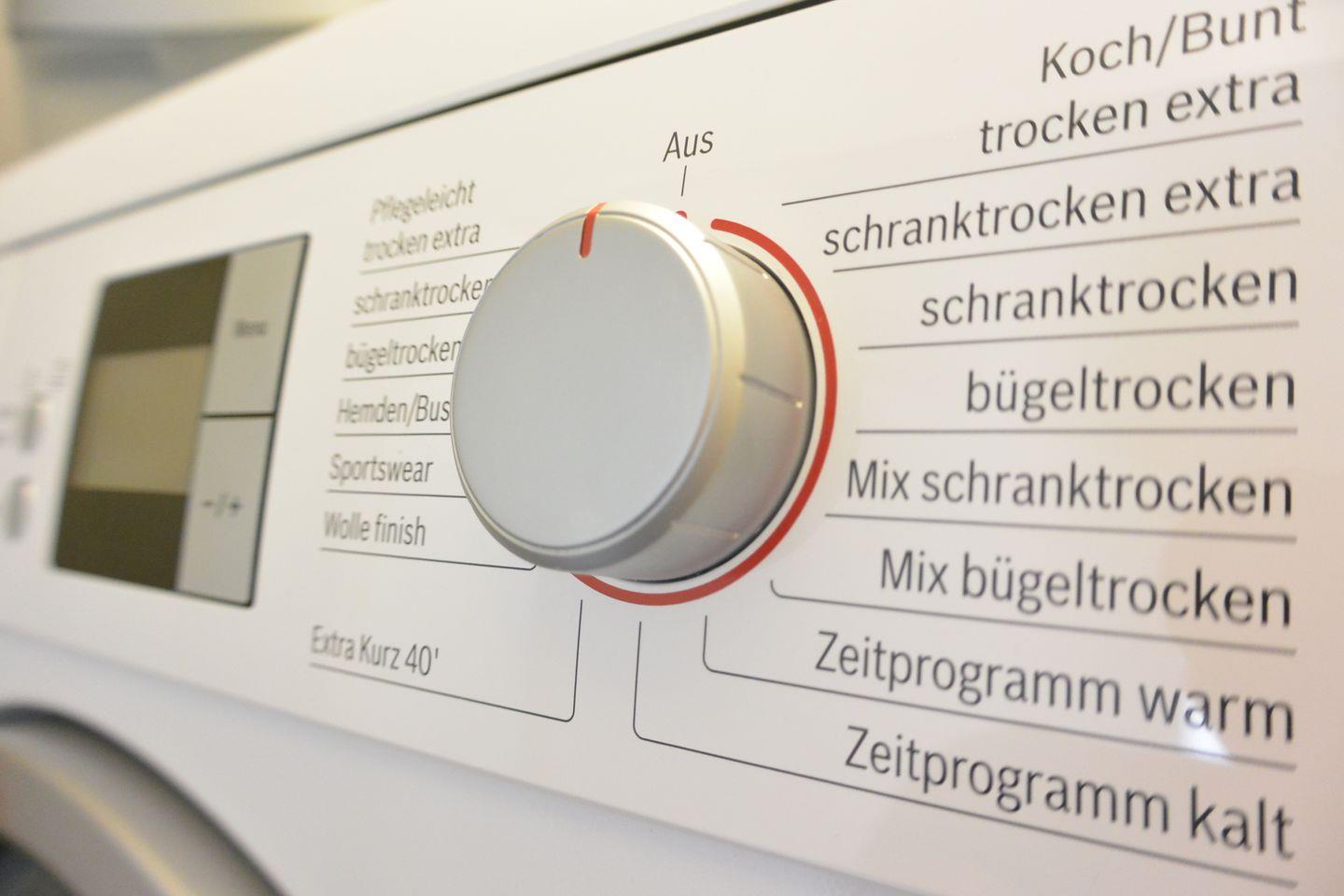 Eine Waschmaschine und ein Trockner sind vorhanden im Abstellraum in der Wohnung, genauso sowie ein eigener Strandkorb auf der Terrasse.