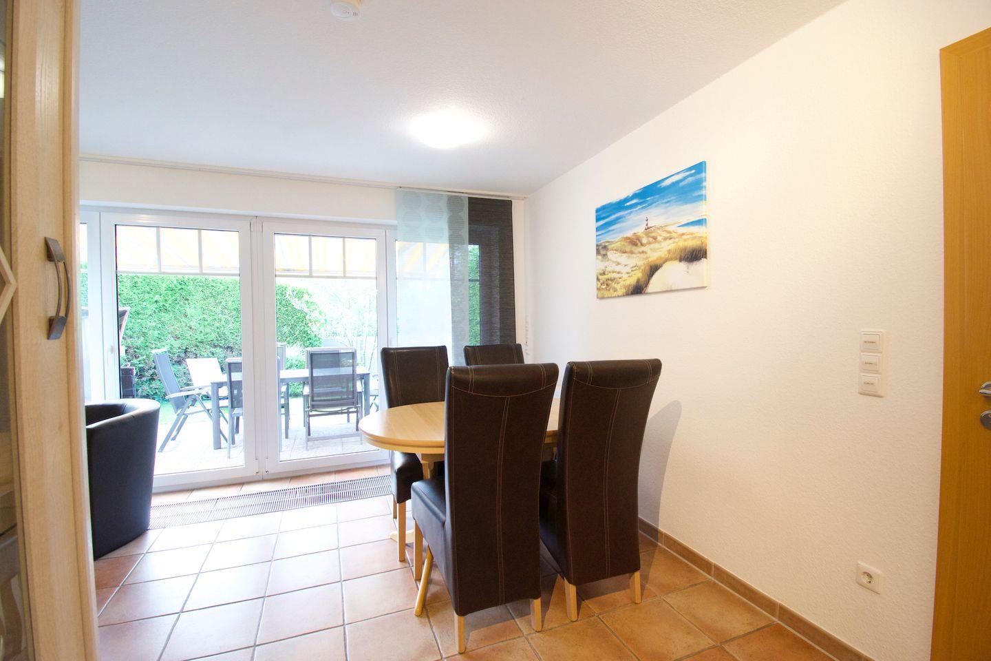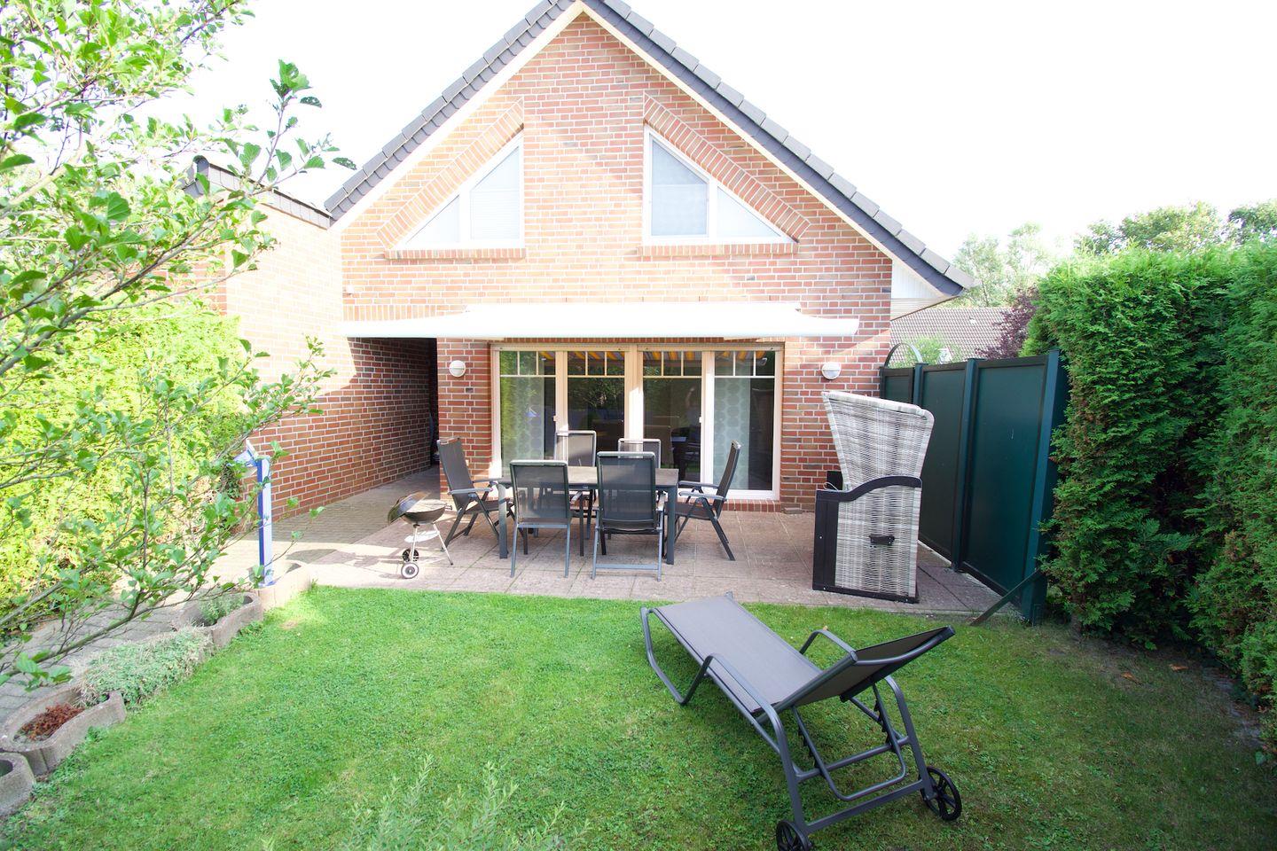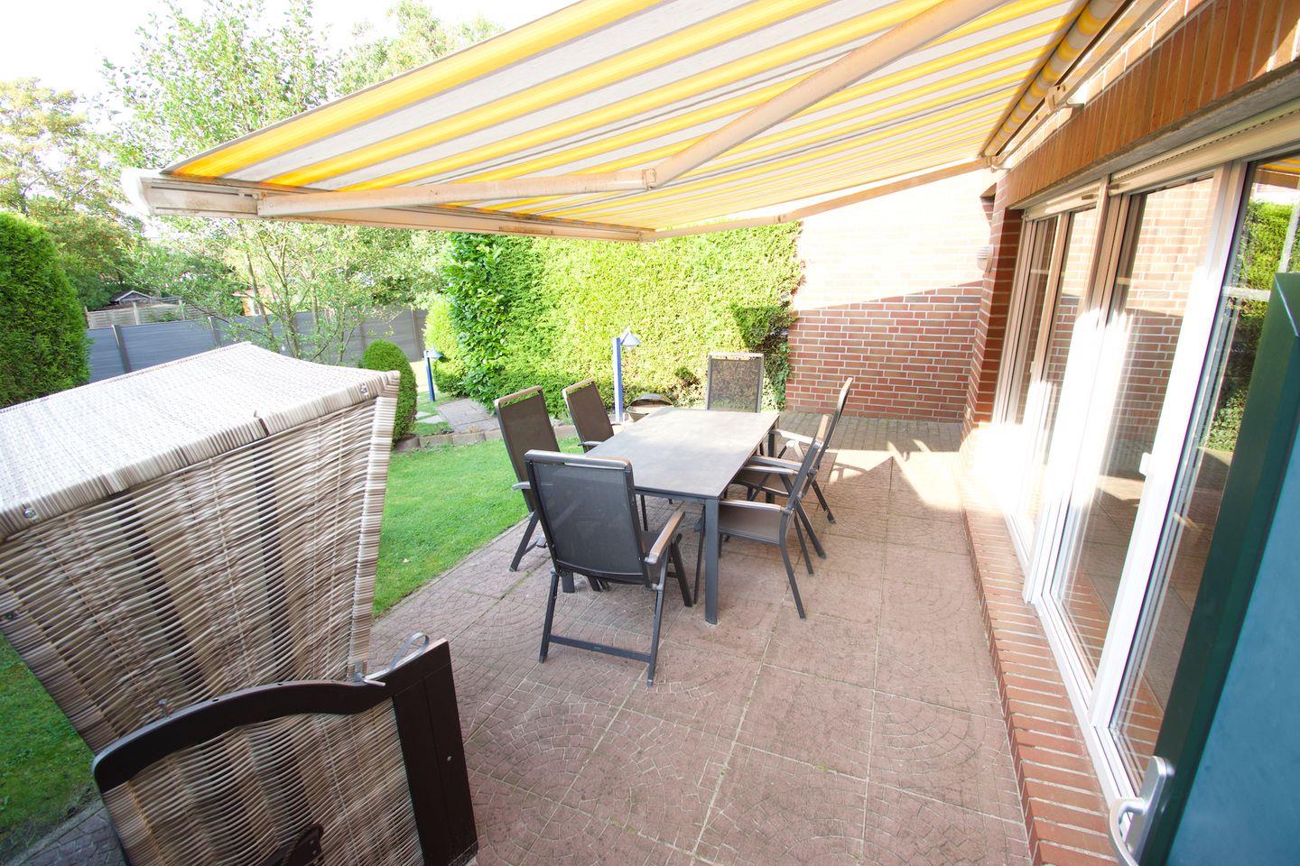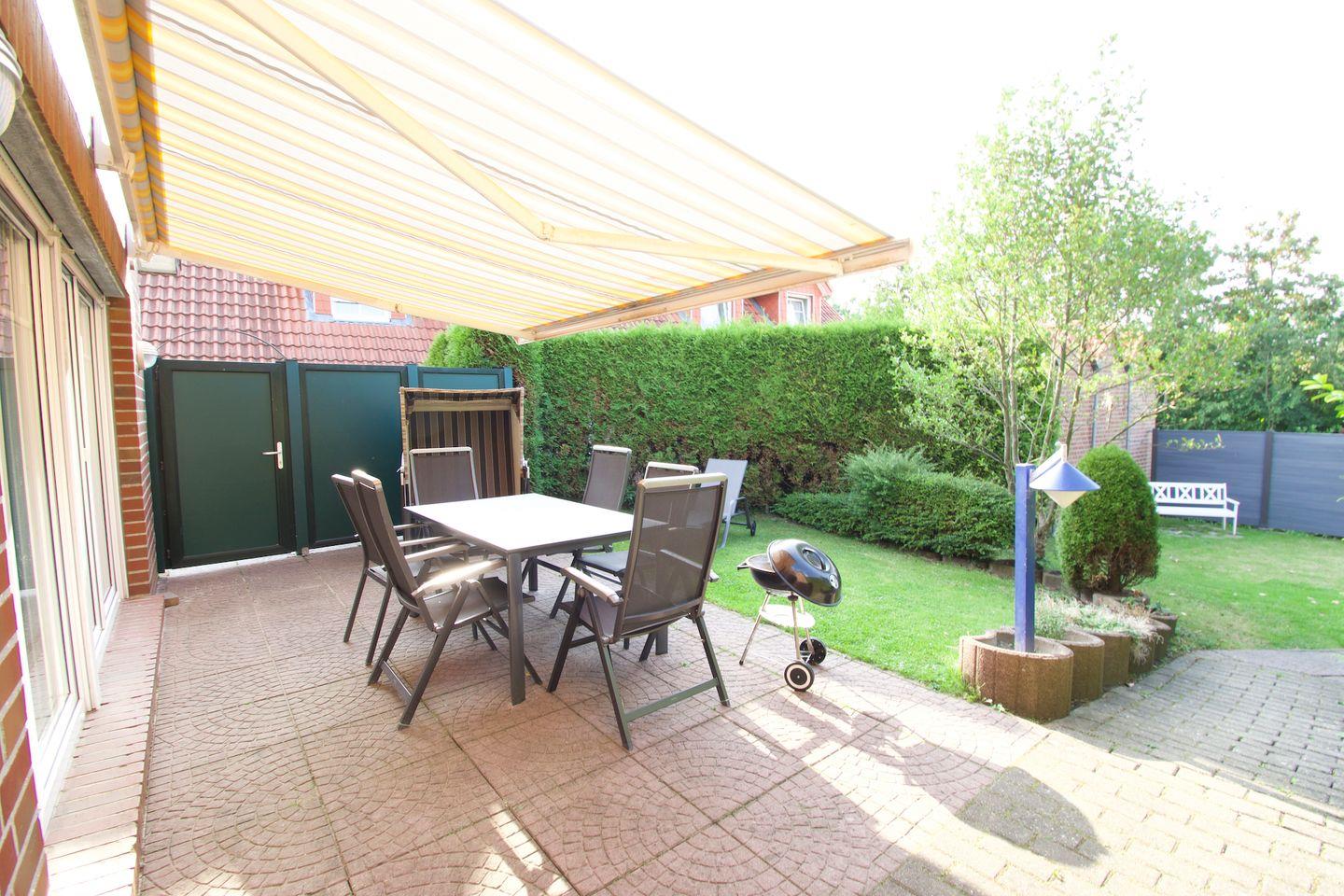 Die Terrasse ist mit einer Markise ausgestattet und verfügt über bequeme Sitzmöglichkeiten, darunter ein Tisch mit sechs Stühlen. Für zusätzlichen Komfort sorgen ein Sonnen- und Sichtschutz sowie ein eigener Strandkorb direkt auf der Terrasse. Ein Grill steht den Gästen ebenfalls kostenlos zur Verfügung.