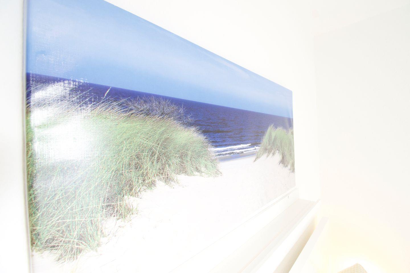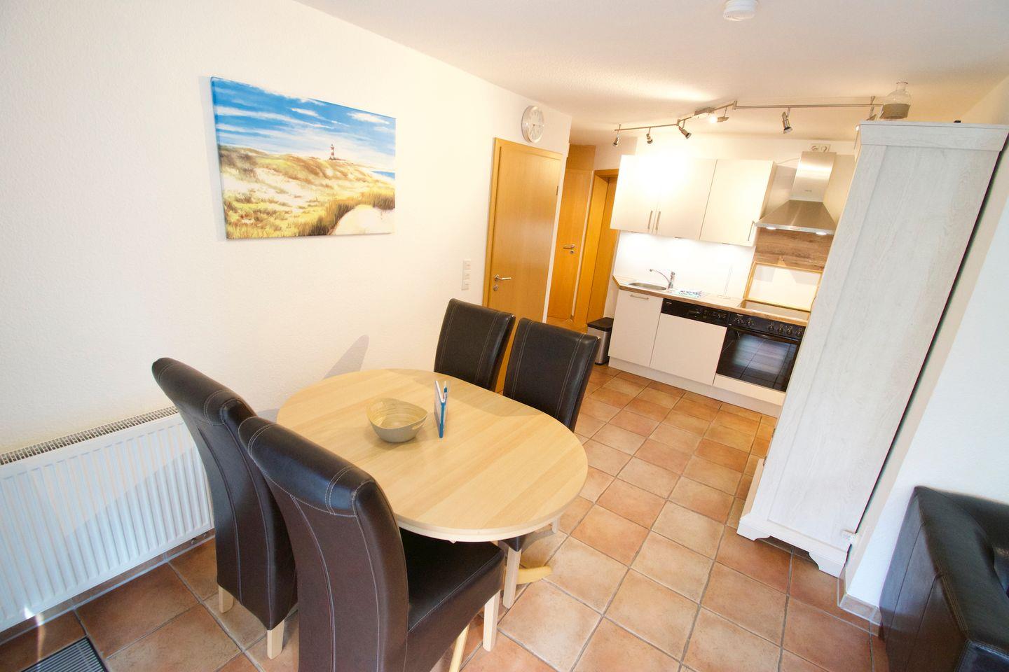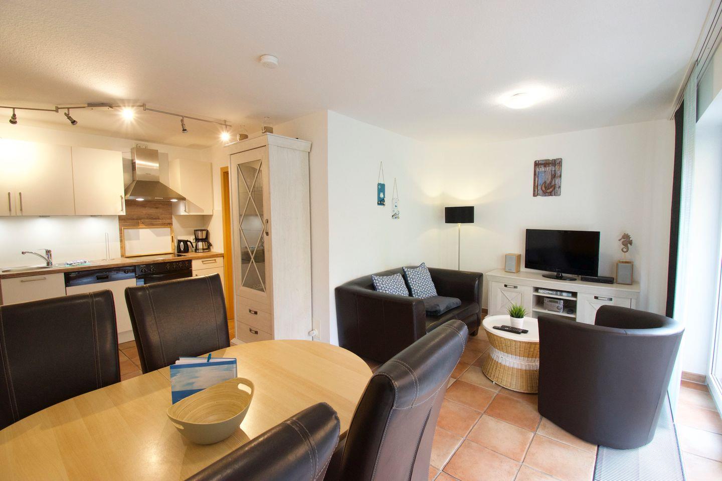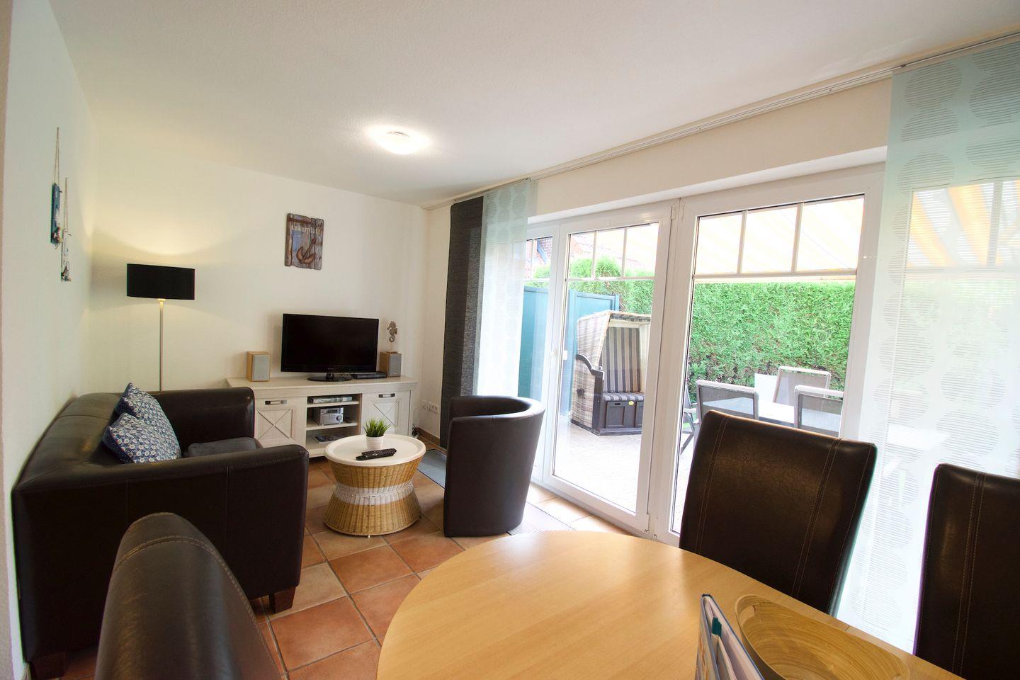Die Terrasse ist mit einer Markise ausgestattet und verfügt über bequeme Sitzmöglichkeiten, darunter ein Tisch mit sechs Stühlen. Für zusätzlichen Komfort sorgen ein Sonnen- und Sichtschutz sowie ein eigener Strandkorb direkt auf der Terrasse. Ein Grill steht den Gästen ebenfalls kostenlos zur Verfügung.