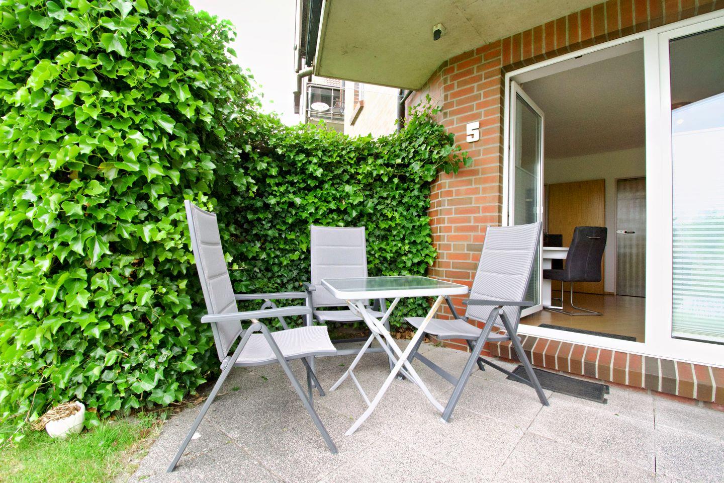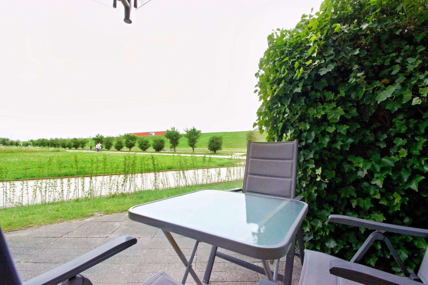 Genießen Sie Ihre eigene möblierte Terrasse mit Blick auf den Deich. Zwei bequeme Relax-Liegestühle und ein großer Tisch laden zum Entspannen ein. Eine natürliche Hecke bietet Sichtschutz und schafft eine angenehme Privatsphäre.