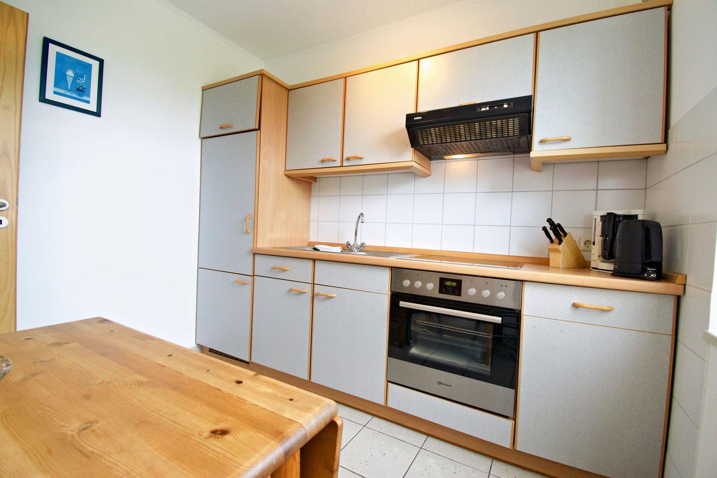 Im Eingangsbereich erwartet Sie einen großen Schrank mit Reinigungsmitteln und Utensilien, einen Staubsauger sowie eine Garderobe mit ausreichend Platz für Jacken und Schuhe. Für Ausflüge ins Wattenmeer stehen Ihnen sogar zwei Paar Gummistiefel zur Verfügung. Zusätzliche Ablageflächen sorgen für Ordnung.