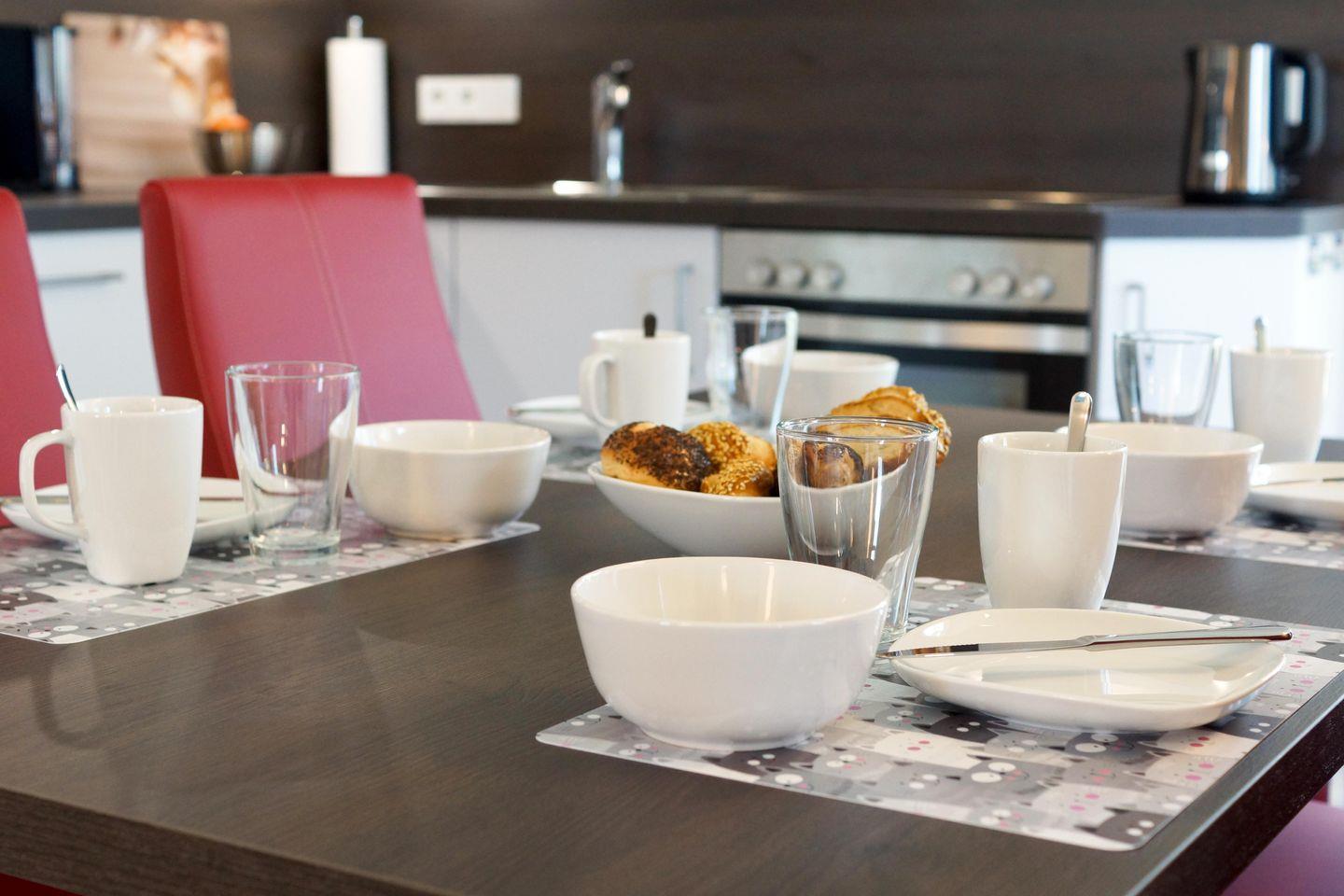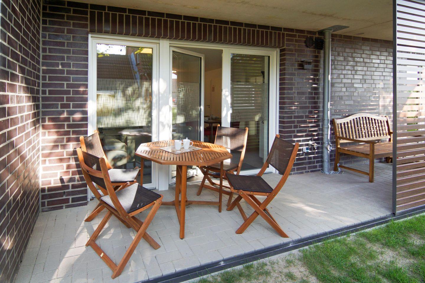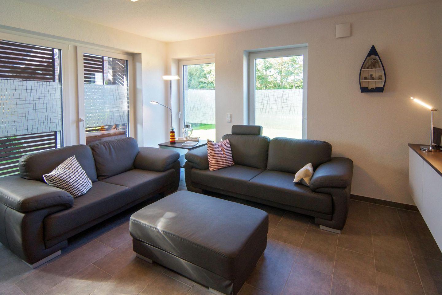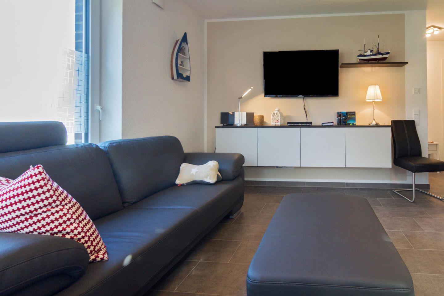 Die Erdgeschosswohnung mit separatem Eingang verfügt über einen Wohn- und Essbereich mit voll ausgestatteter Küche, zwei Schlafzimmer, Gleich drei Fernseher (Kabel-TV, HD, 50 Zoll (ca. 127 Zentimeter)), CD-Player und Blu-Ray-DVD sowie Highspeed-Internet über Kabel bieten Unterhaltung vom Feinsten. Für warme Füße sorgt in allen Räumen die Fußbodenheizung, die teils bodentiefen Fenster sind mit elektrischen Rollläden ausgestattet. Zur Wohnung gehört eine Terrasse und ein kleiner Garten. Die Wohnung ist durch ihre Ebenerdigkeit und den extra breiten Parkplatz (5 × 2,7 m) behindertenfreundlich. Für die Kleinsten gibt es einen Spielplatz (Gemeinschaft).