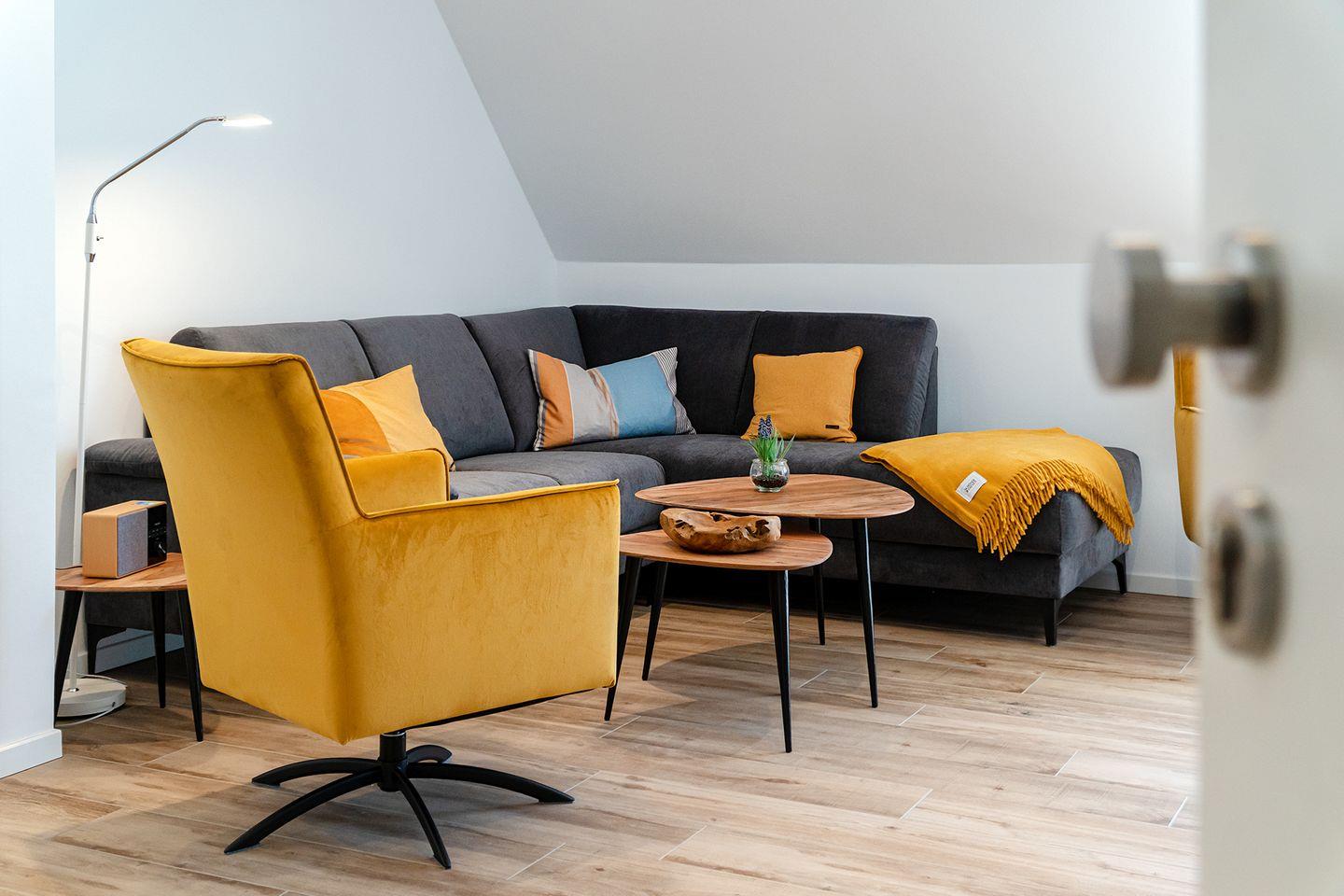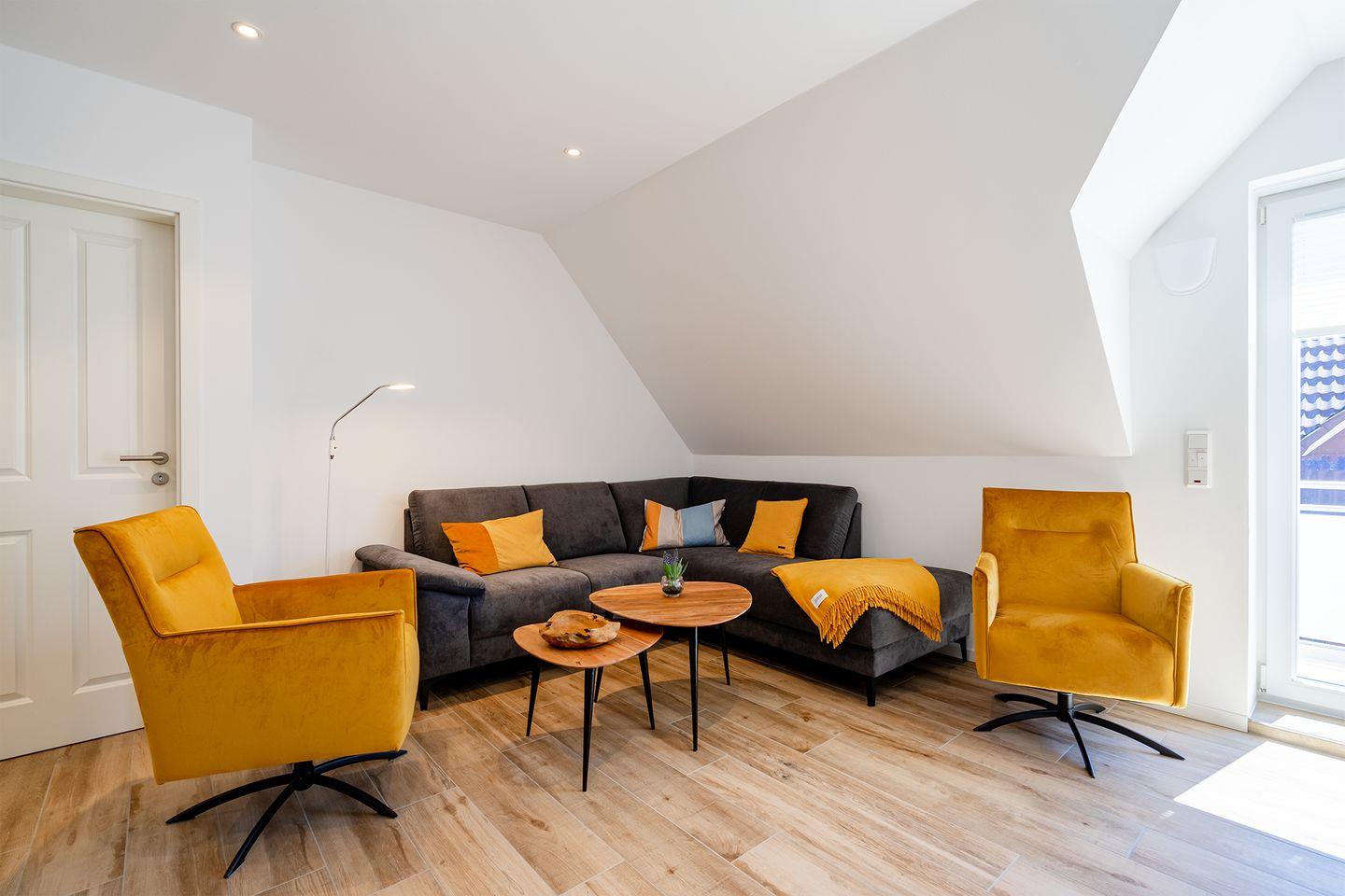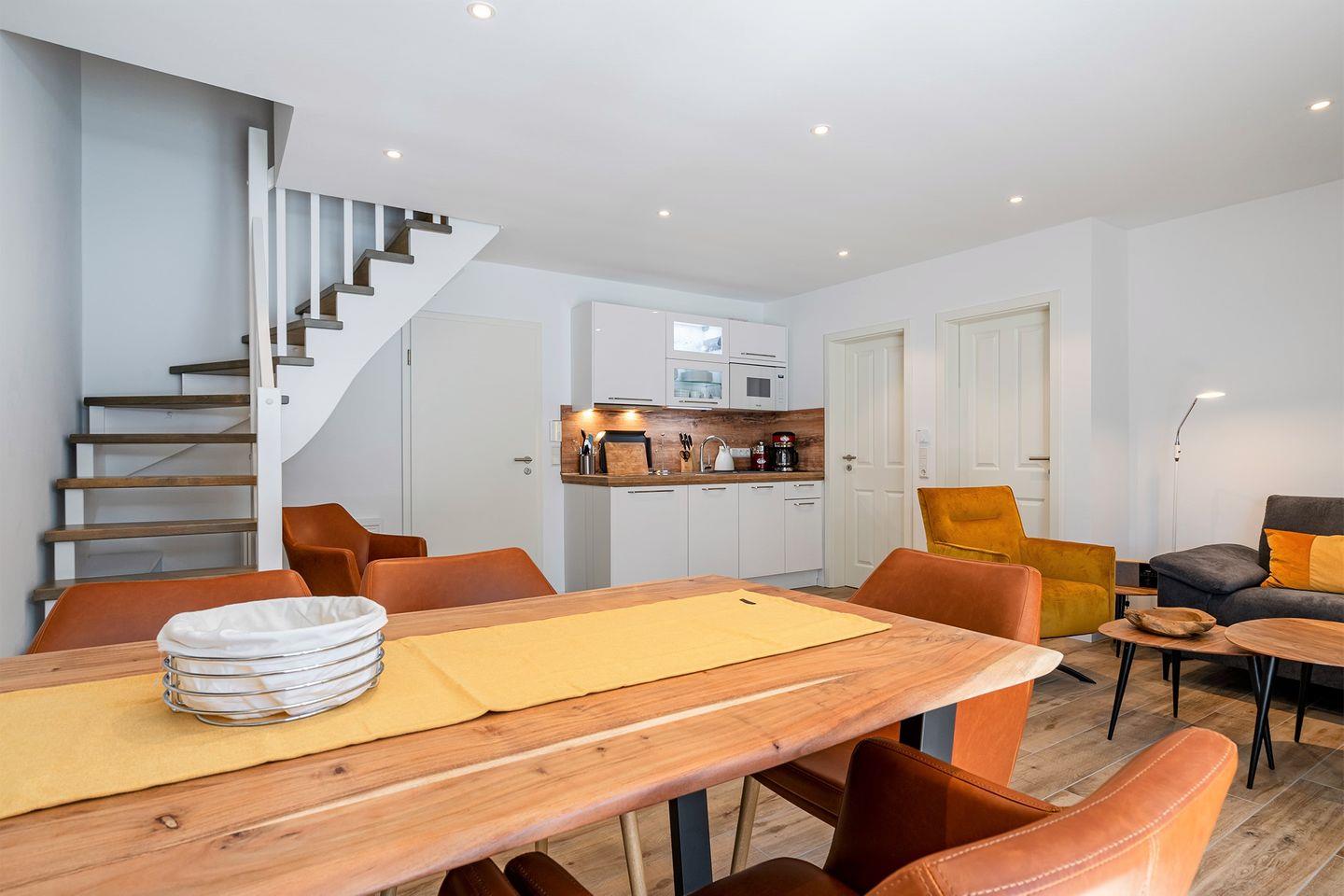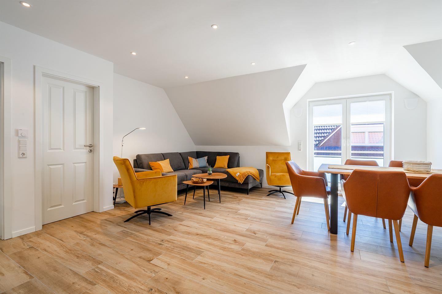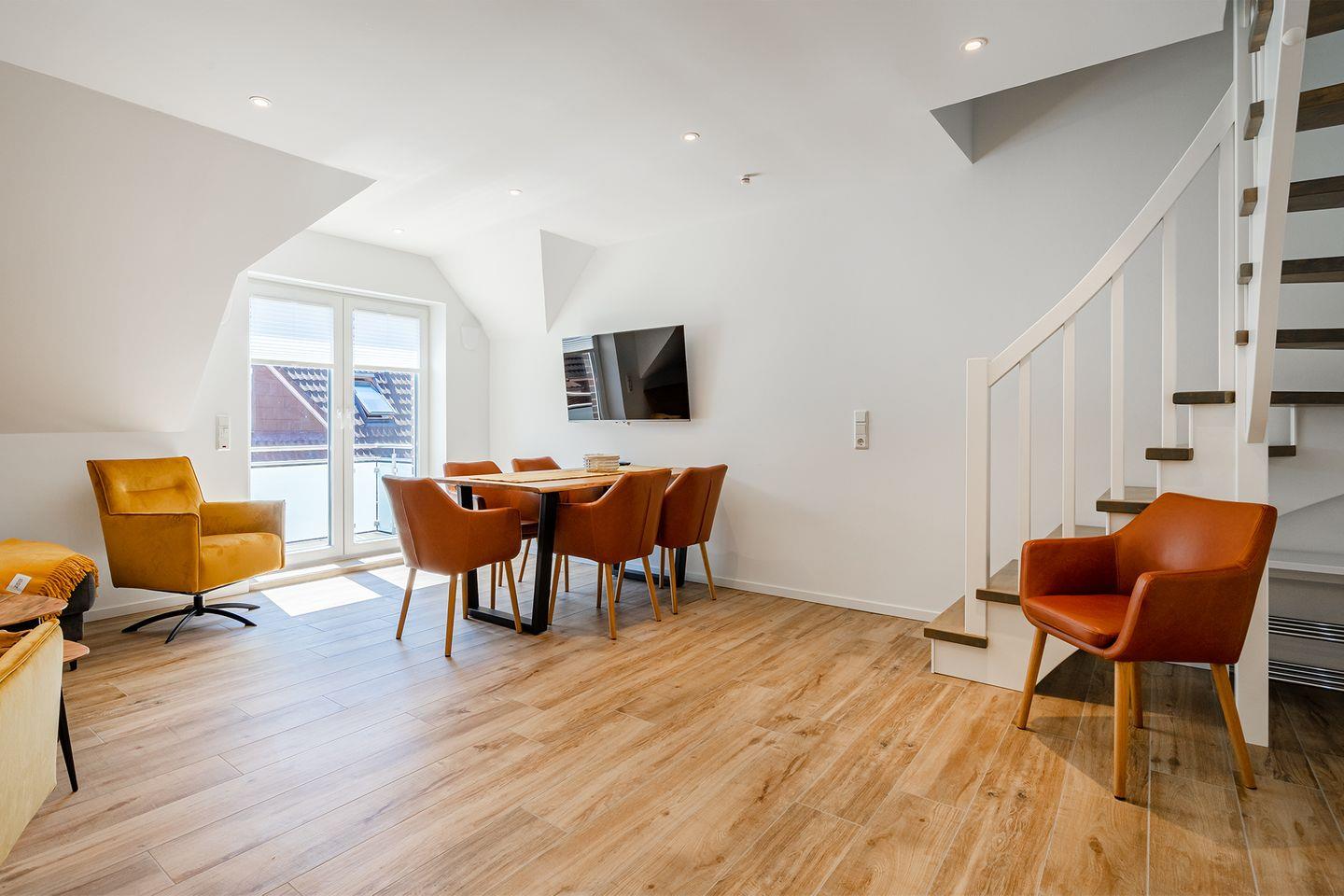 Die Maisonette-Ferienwohnung von 62qm befindet sich in einem neu erbauten Haus unweit des Strandes. Nur wenige Meter müssen zurückgelegt werden bis zum Deich und der Strandpromenade. Hier finden bis zu sechs Personen und ein Kleinkind (unter 2 Jahre) Platz. Der großzügige Wohn- und Essbereich ist strahlend hell und mit allen Annehmlichkeiten wie Couchgarnitur, Esstisch mit 6 Stühlen, großes Smart-TV und WLAN ausgestattet.