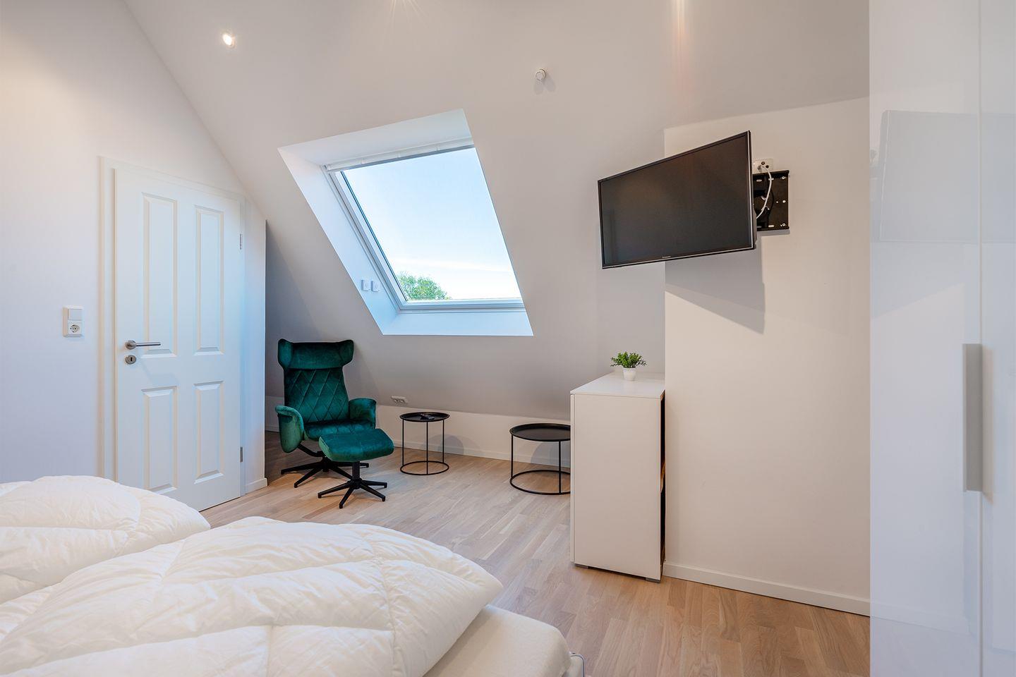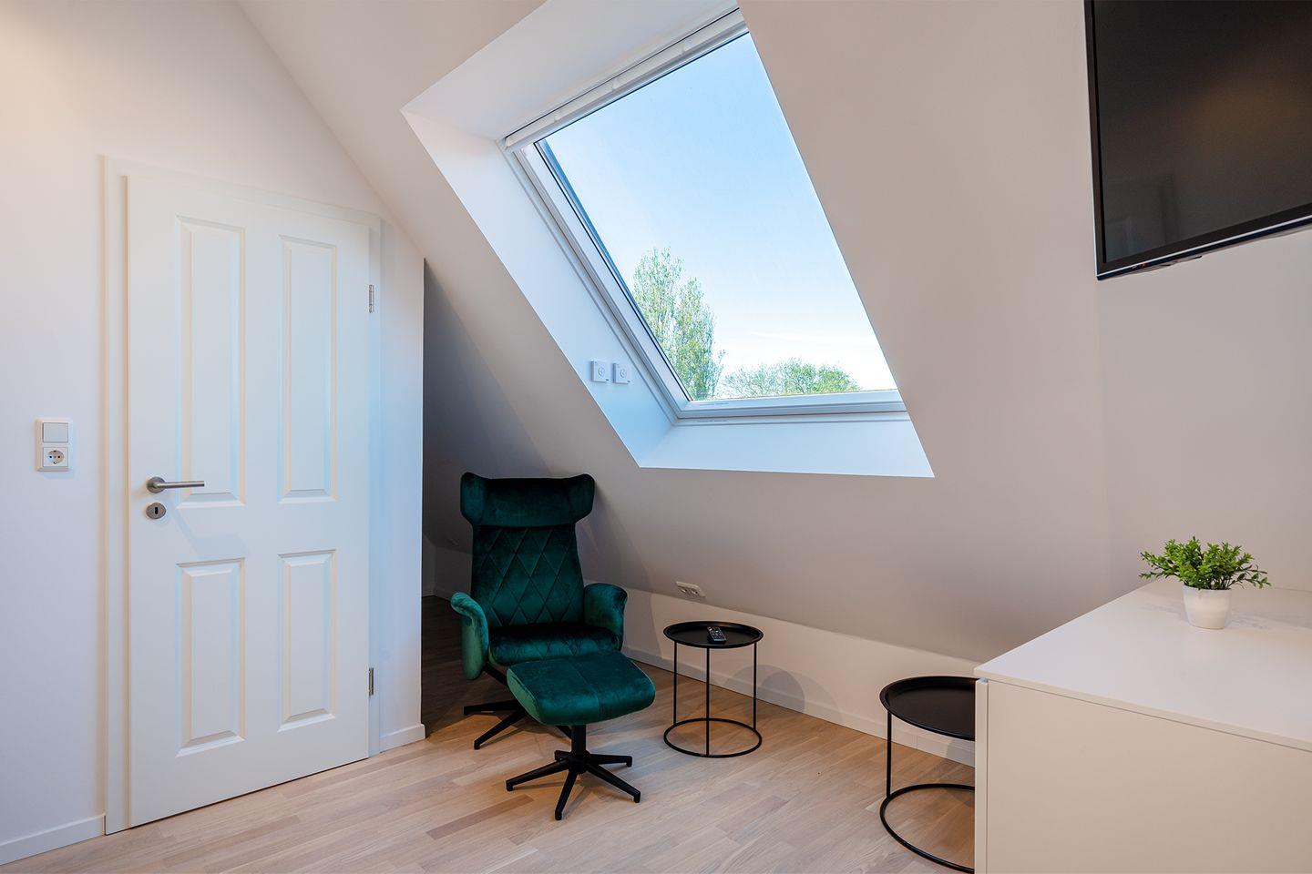 Alle Dachfenster in der Wohnung sind elektrisch zu öffnen und mit elektrischem Außenrollladen (Verdunkelung). Die Wohnung verfügt über einen Parkplatz vor dem Haus. Hinter dem Haus befindet sich ein überdachter Fahrradparkplatz inklusive Steckdosen für E-Bikes.