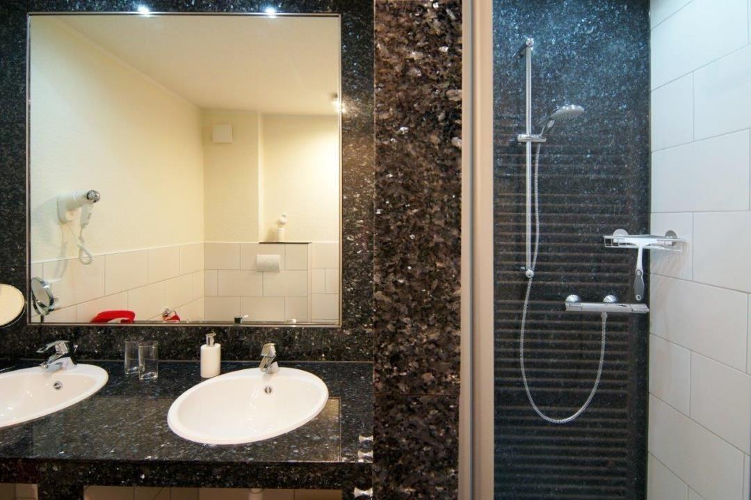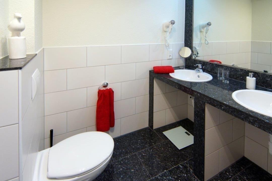 Das komfortable Duschbad ist durch das große Tageslichtfenster hervorragend Belüftet. Der Doppelwaschtisch sorgt für eine angenehme Entzerrung am Morgen und Abend. Hinter den Waschbecken wurde ein großer Spiegel angebracht. Die Dusche lässt sich mit einer Glastür verschließen. Ein Fön liegt bereits für Sie bereit. Besonders in der kalten Jahreszeit wird das Bad durch seine Fußbodenheizung angenehm erwärmt.