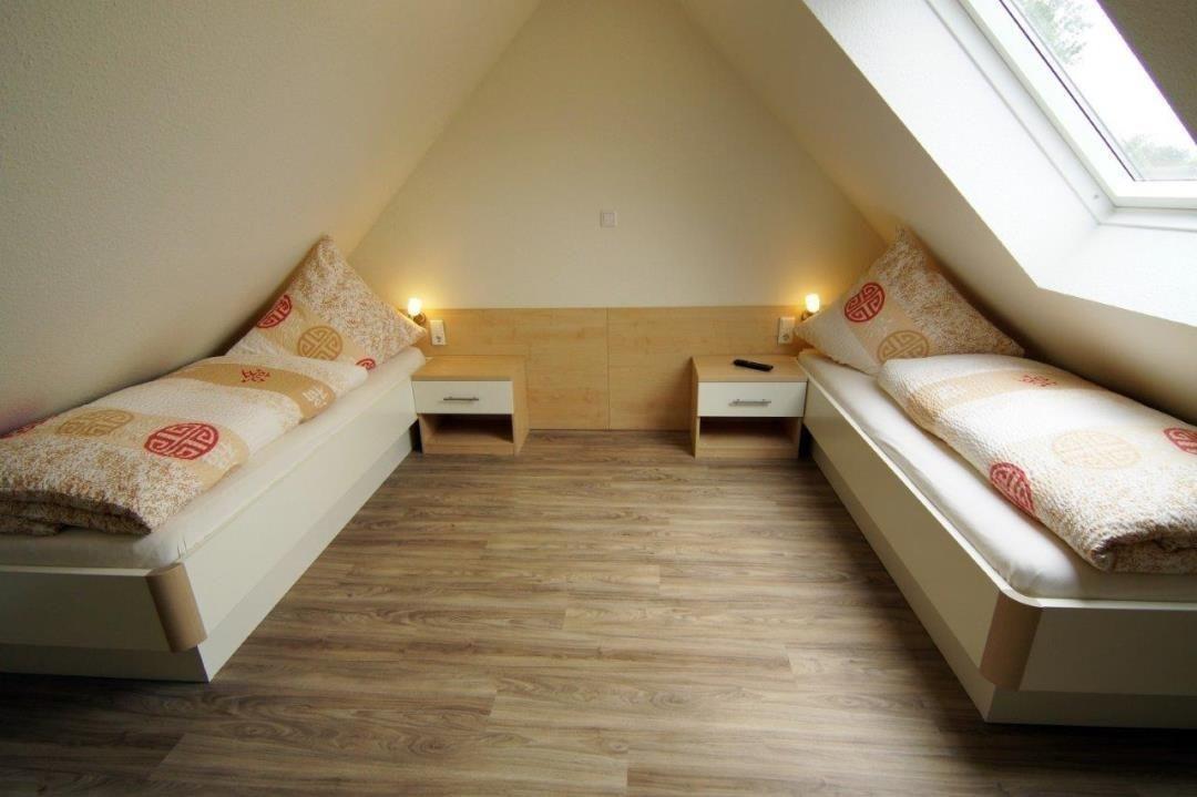 Auf der gleichen Ebene wie der Wohnraum befindet sich das erste Schlafzimmer der Wohnung. Mit einem Doppelbett möbliert eignet es sich hervorragend als Elternschlafzimmer. Über die Treppe erreichen Sie das Dachgeschoss, in welchem sich das zweite Schlafzimmer befindet. Dieses ist mit zwei Einzelbetten ausgestattet, die sich bei Bedarf auch zu einem Doppelbett zusammenstellen lassen.