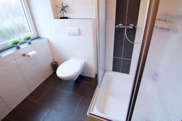 Auch das Badezimmer mit Tageslichtfenster ist im modernen Stil ausgestattet. Durch die vorhandene Fußbodenheizung wird der Raum angenehm erwärmt. Es handelt sich um ein Duschbad. Die Dusche wird von einer festen Kabine umschlossen.