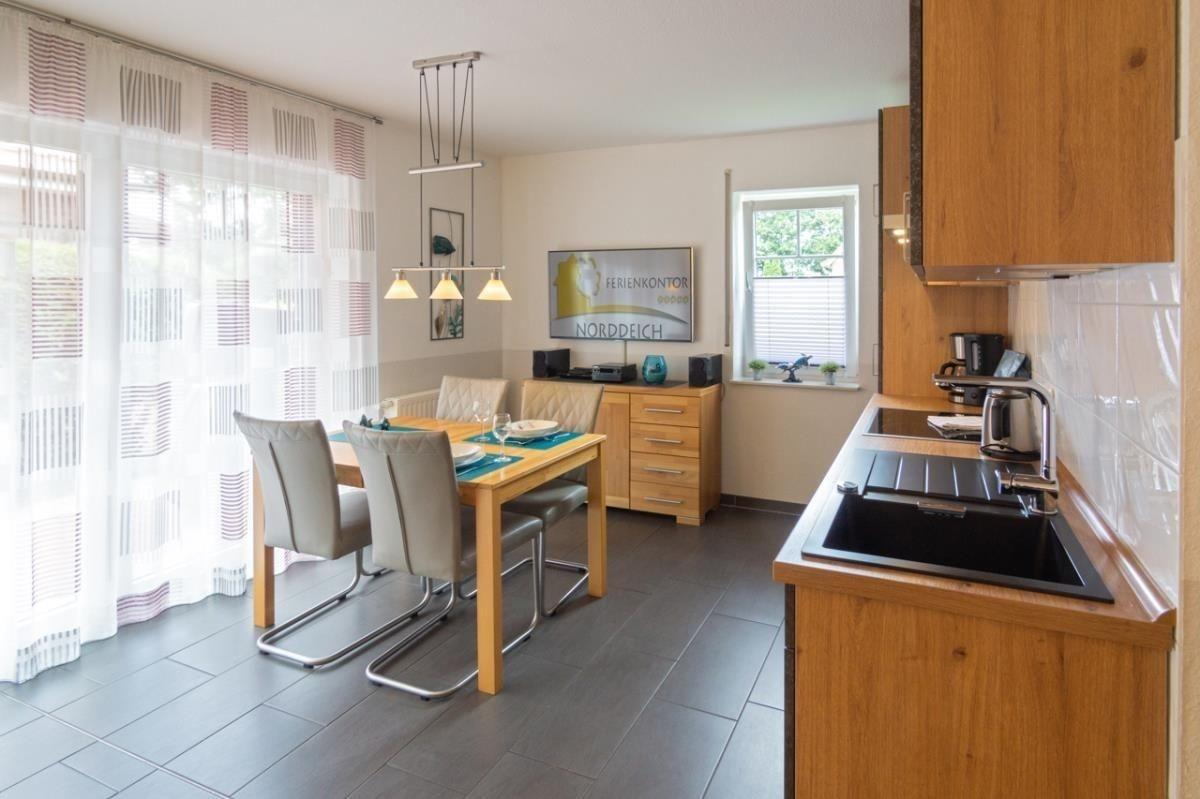 Moderne Ferienwohnung in attraktiver Lage von Norddeich. Genießen Sie die Seeluft auf der eigenen Terrasse mit Strandkorb oder den Komfort im attraktiv eingerichteten Inneren der Unterkunft. Geeignet für zwei Gäste - gerne auch mit einem Kleinkind!