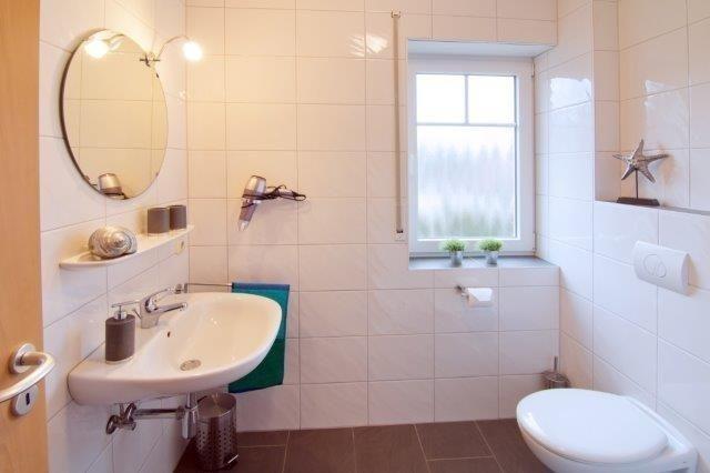 Waschbecken, Spiegel, Fön und WC komplettieren die Ausstattung des Bades ansprechend.