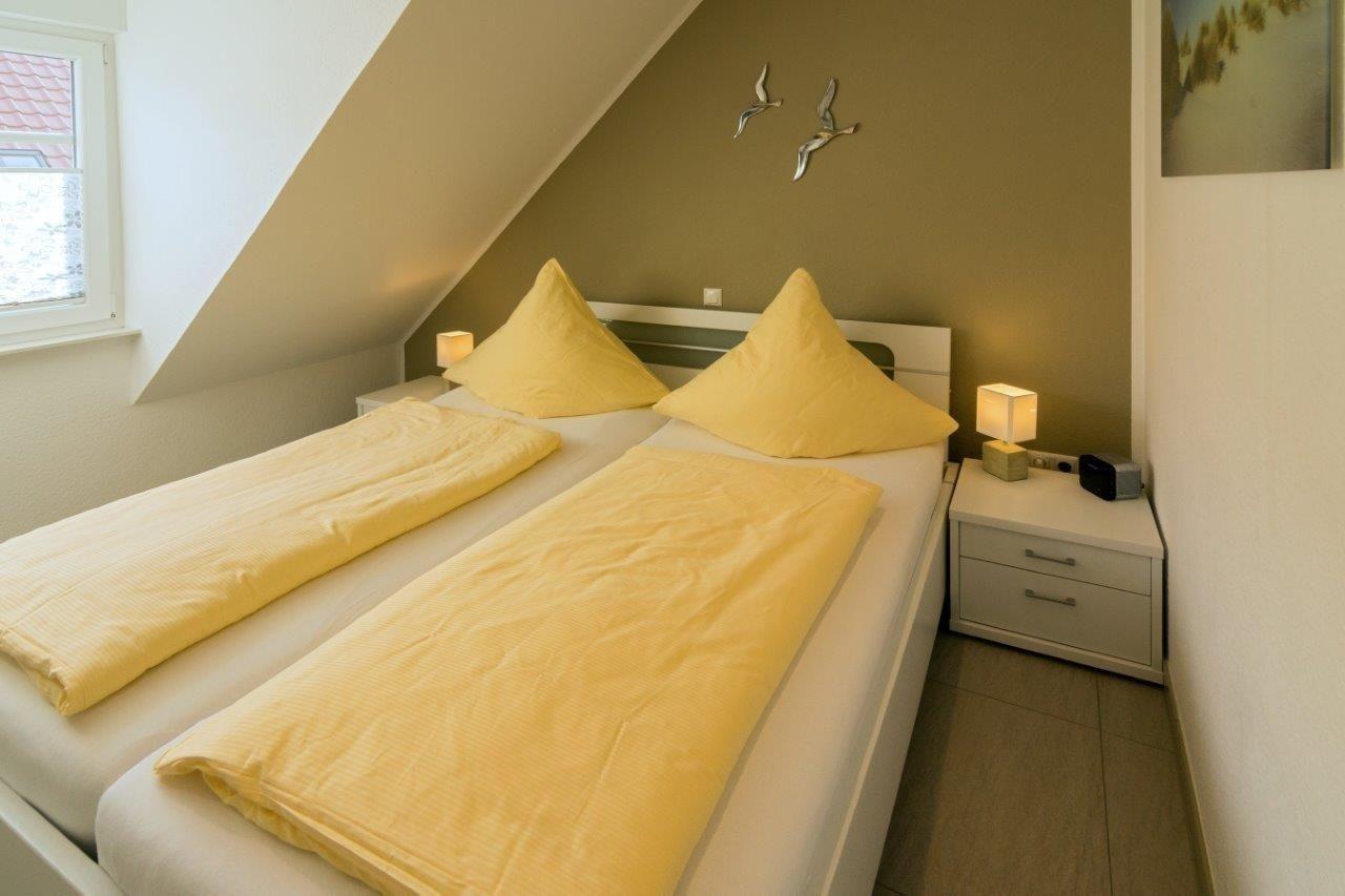 Neben dem Wohnbereich befindet sich auch das erste Schlafzimmer im ersten Obergeschoss. Mit einem großzügigen Doppelbett (180x200cm) ausgestattet bietet Ihnen der Schlafraum einen Platz zum Träumen. Nachttische und Radiowecker sowie LED-Nachttischlampen ergänzen das Bett stimmig.