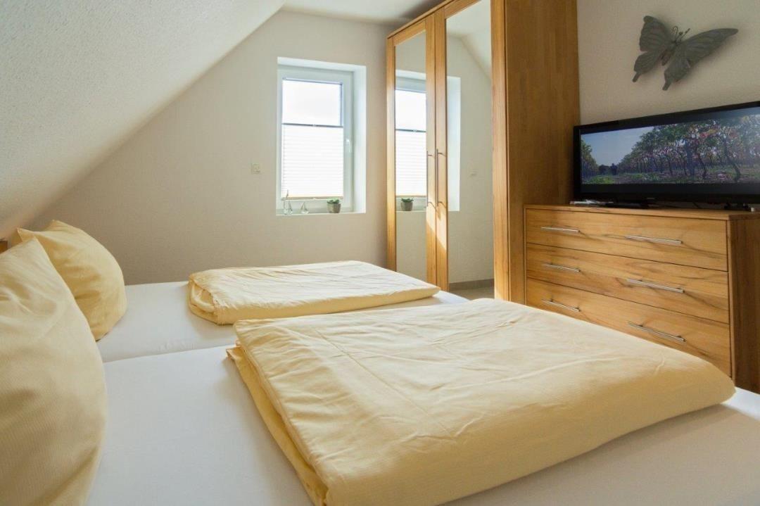 Der eigene Fernseher (SAT-TV) rundet die Ausstattung des Schlafzimmers ab.