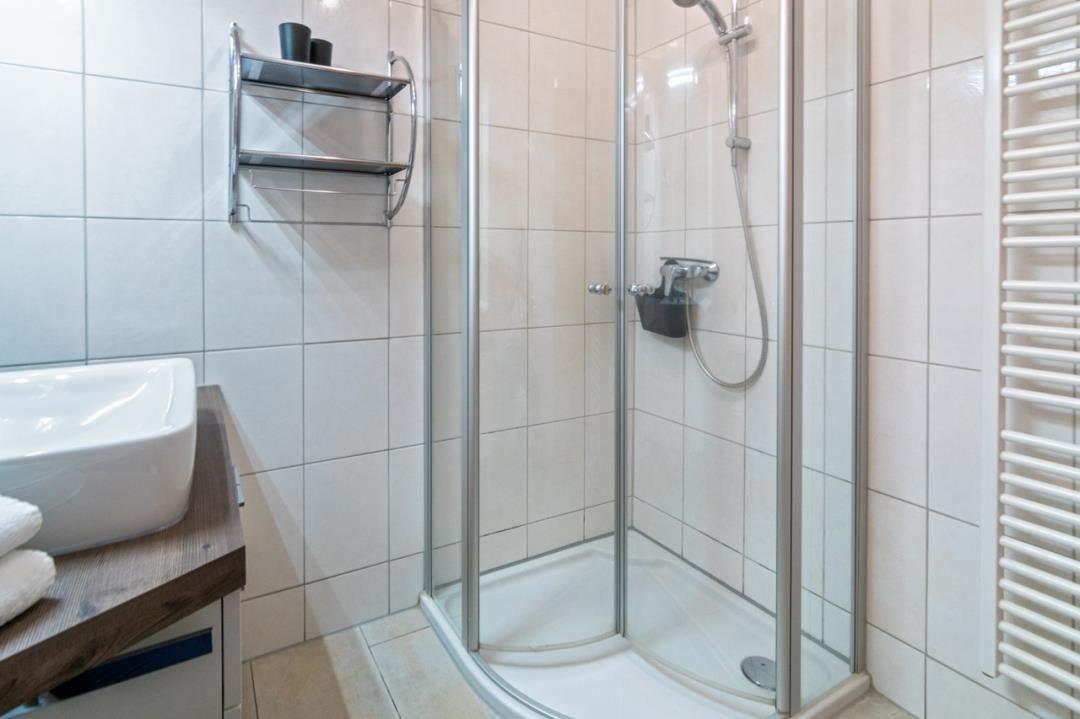 Auch das Badezimmer bietet Ihnen allen wünschenswerten Komfort. Eine bodennahe Eckdusche, WC und Waschkombination mit Spiegel gehören ebenso zur Ausstattung des Bades wie ein Duschhocker und ein Föhn.