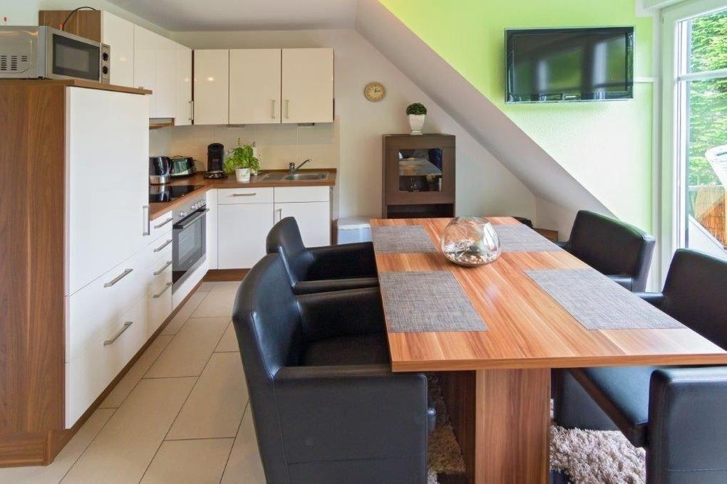 Eine gemütliche und moderne Couch & Sessel + Tisch, neuer Flat LCD TV inklusive Sat-TV, 4 Sitzmöglichkeiten im Küchenbereich / Essecke und Spiele.